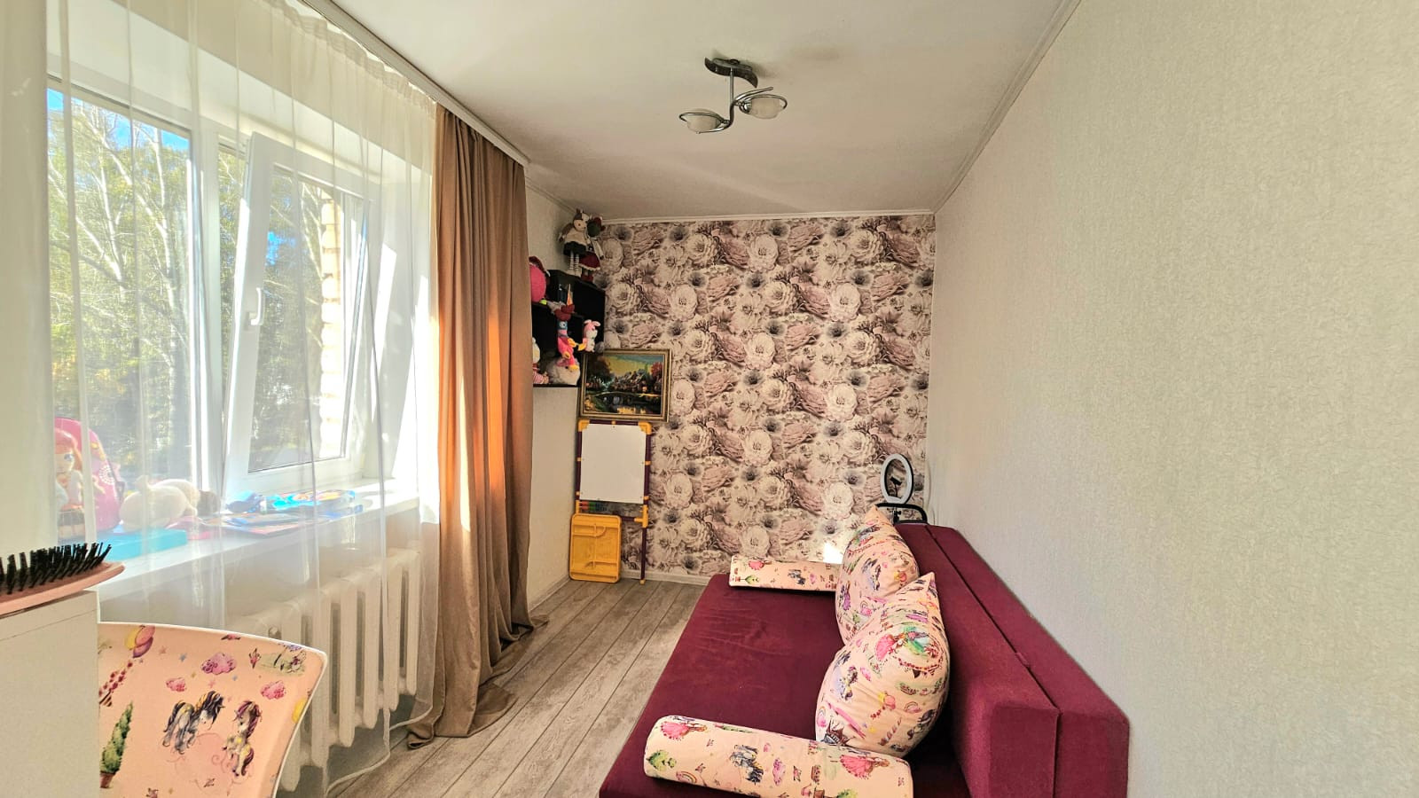 Интересная квартира, внутри квартала. Квартира на третьем этаже пятиэтажного дома. Кирпичный дом. Рядом садики, школа, магазины.