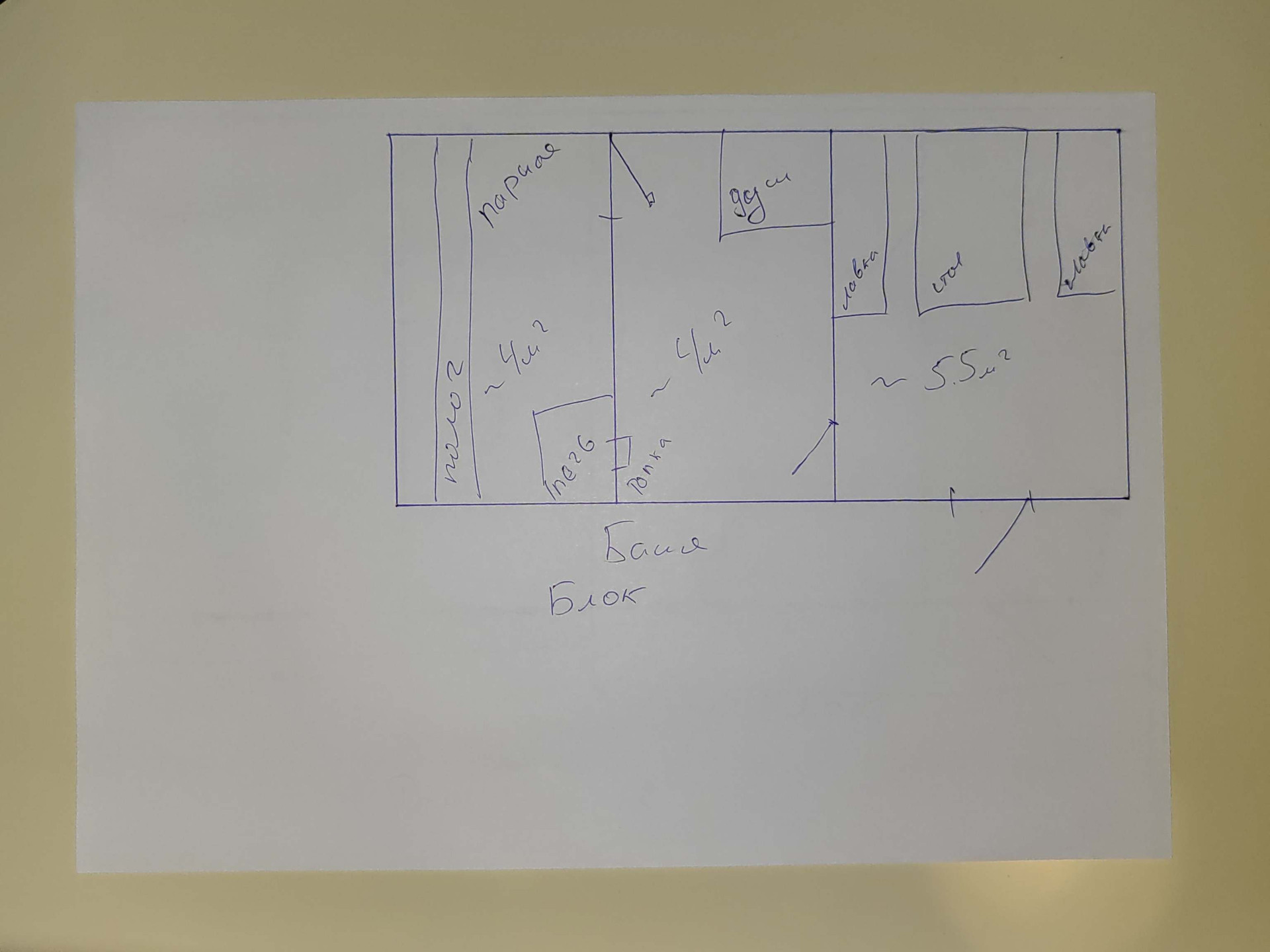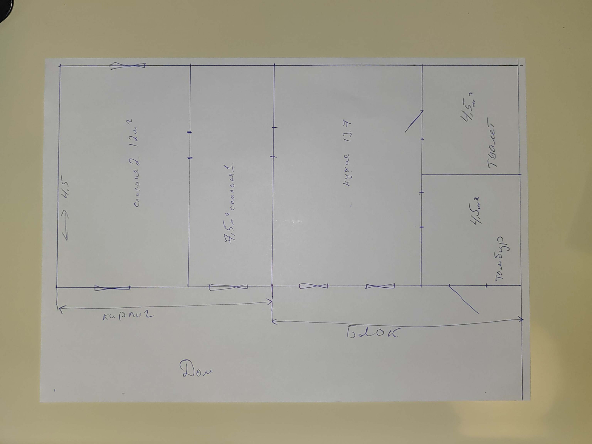 Дом состоит из двух частей, кирпичная часть 3 комнаты, блочная часть комната + тамбур и туалет. план на фото