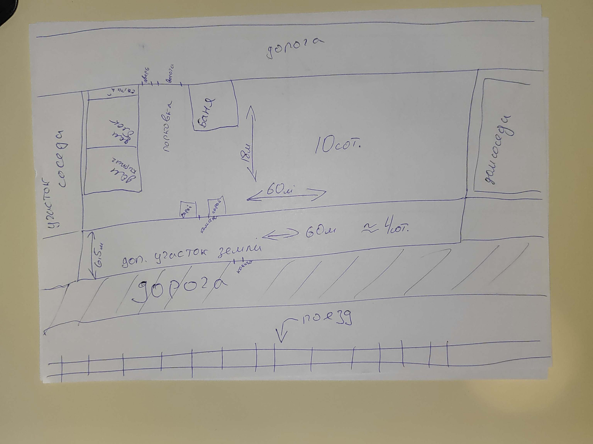 Большой прямоугольный участок 18*60= 10сот + 6.5*60(с забором)=4 сот. план на фото