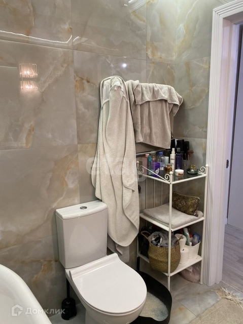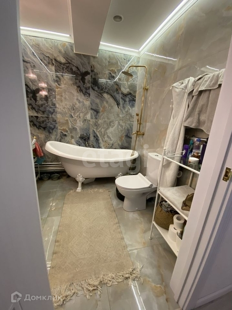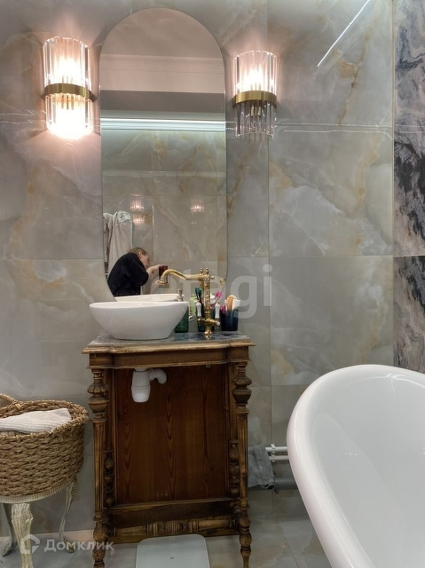 Очень красивый дорогой санузел из дизайнерской плитки с двумя сценариями освещения и мраморной ванной, а также дизайнерской старинной консолью 19в.