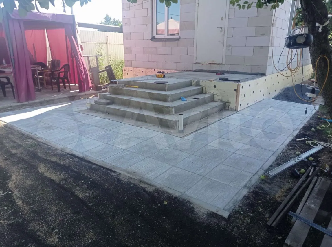 Утепленная отмостка вокруг дома шириной 125см. из специальных материалов исключит подмерзание фундамента в зимнее время. Уложена плитка с бордюрами вокруг прихожей и крыльца.