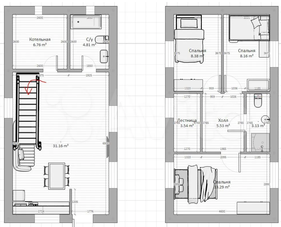 На первом этаже просторная кухня-гостиная, котельная и ванная. На втором три комнаты и полноценный с/у с выводами под раковину, унитаз и душевую кабину. Второй этаж на данном этапе можно изменить и сделать две большие комнаты. На первом этаже полы залиты бетонной стяжкой под водяной теплый пол, материалы для него оставляю + проект по раскладке. Расчетная высота чистового потолка на 1-м этаже 2,8м, на 2-м 2,5м.