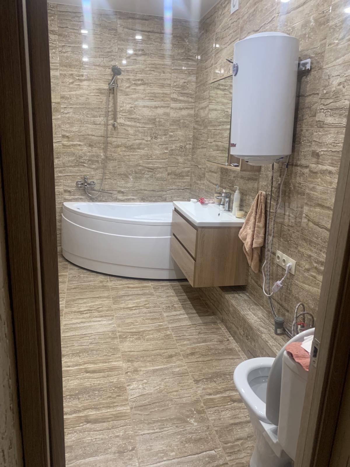 - для отделки санузлов использован широкоформатный керамогранит (600 мм - пол, 1200 мм - стены);