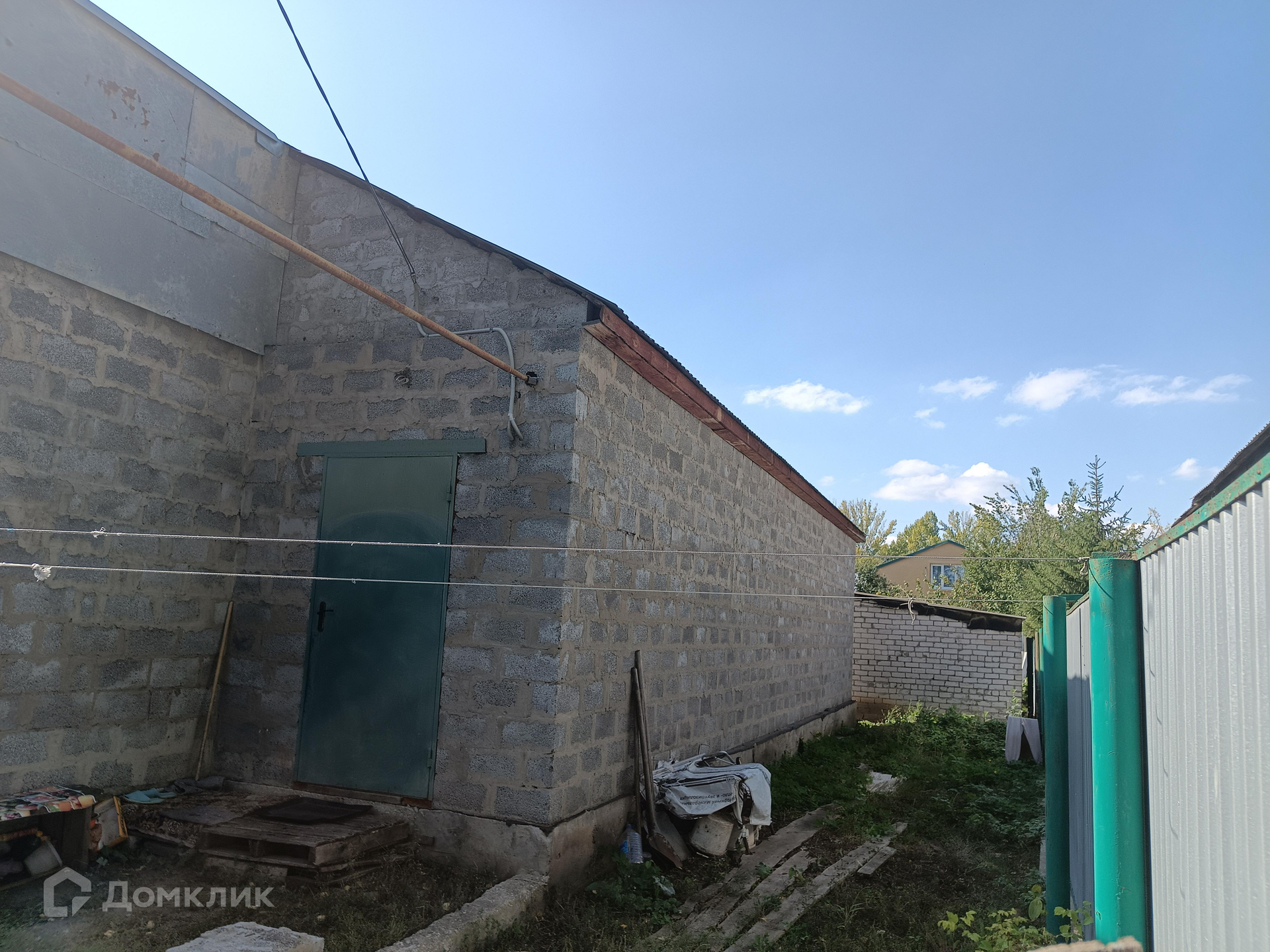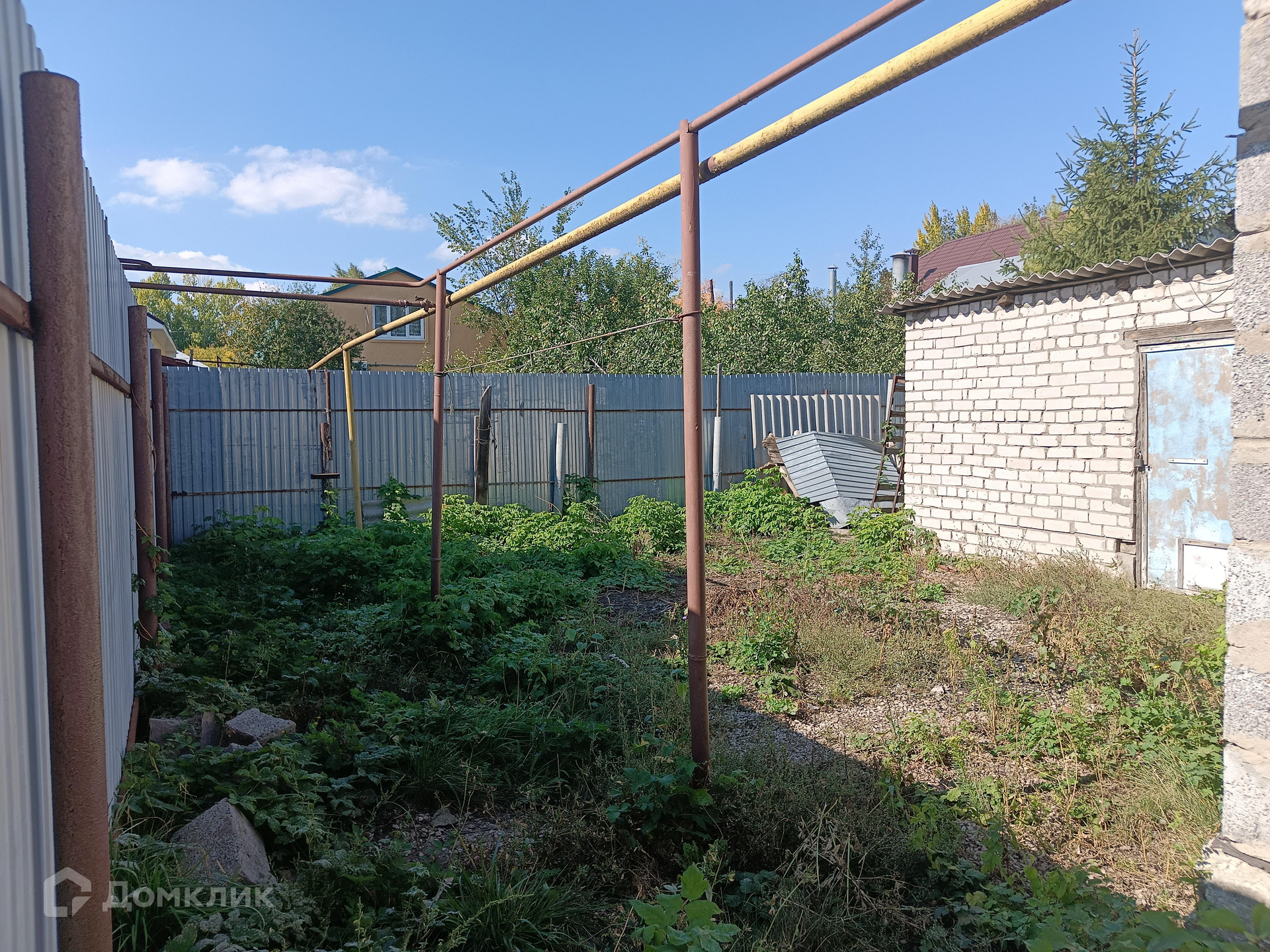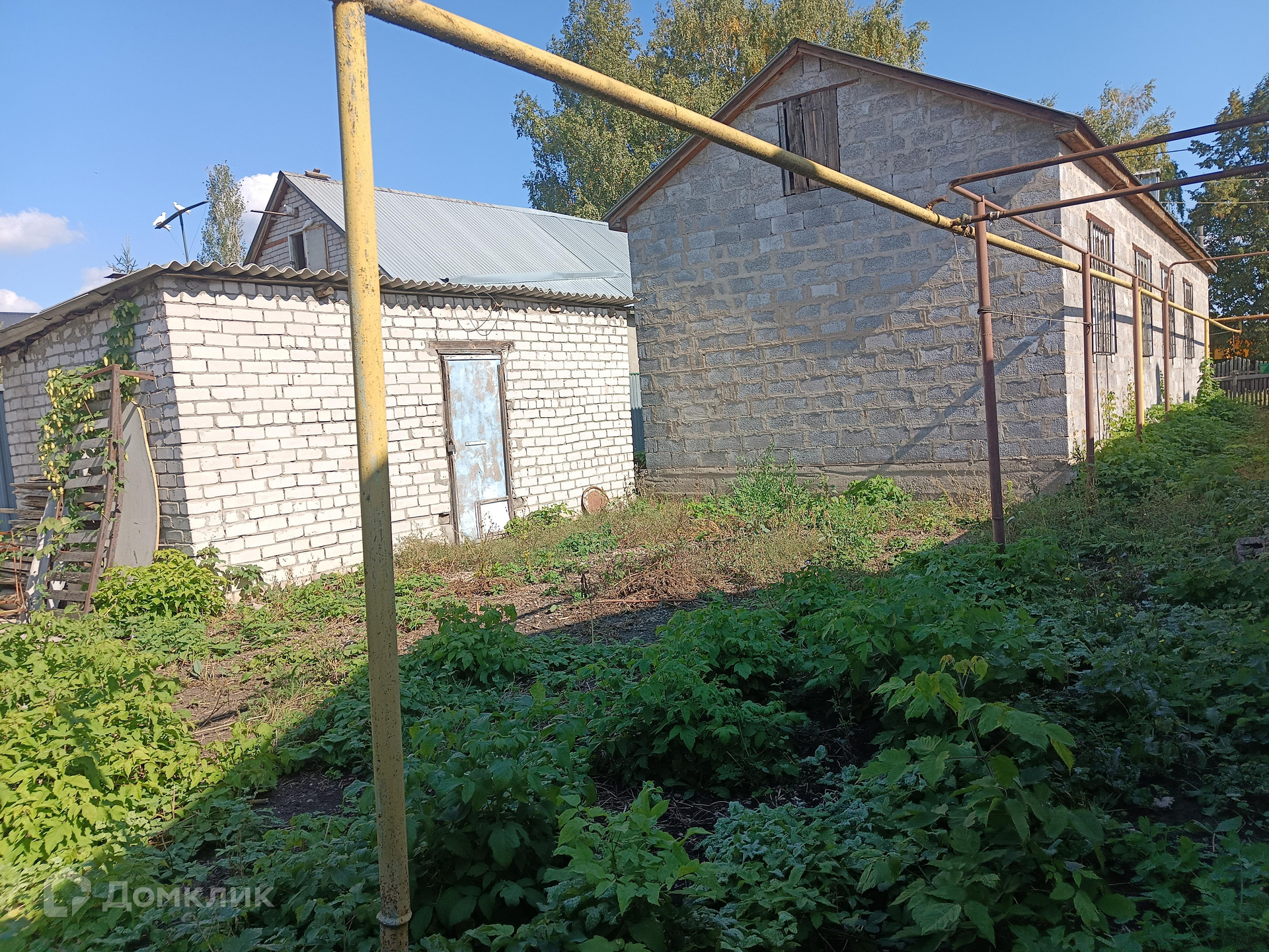 На участке гараж из белого кирпича.