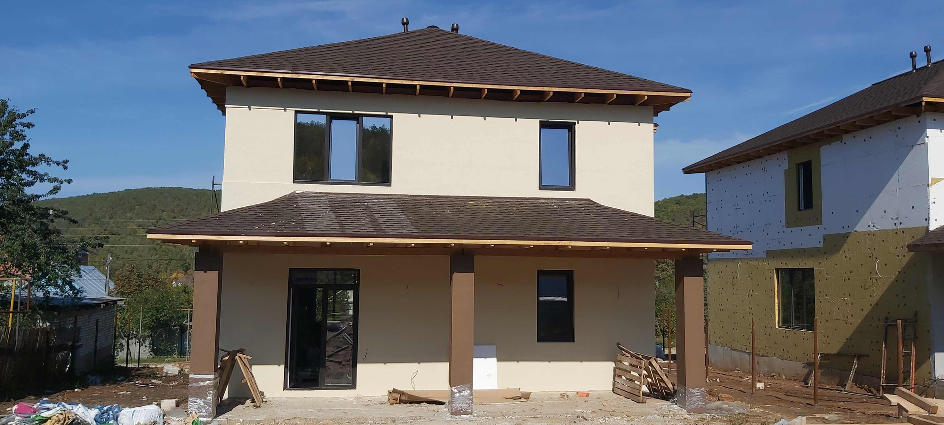 Стены газоблок плюс утеплитель, фундамент сваи+ ростверк с утеплением пеноплексом, монолитная плита на первом этаже так же утеплена пеноплексом, перекрытия между 1 и 2 этажом ж/б плиты.Крыша мягкая кровля благодаря ей у вас всегда в доме будет тихо и не будет скапливаться снег. Фасад с декоративными вставками дерева. Есть фото всех этапов работ.