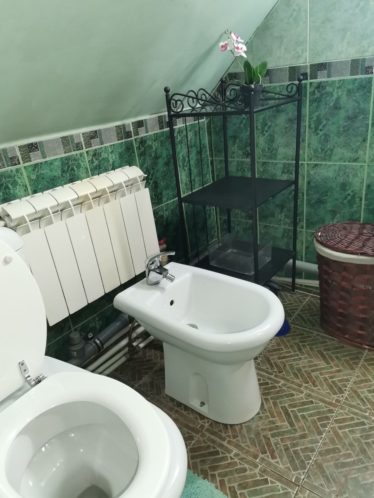 Санузел совмещённый - душевая кабина, туалет, биде, раковина.