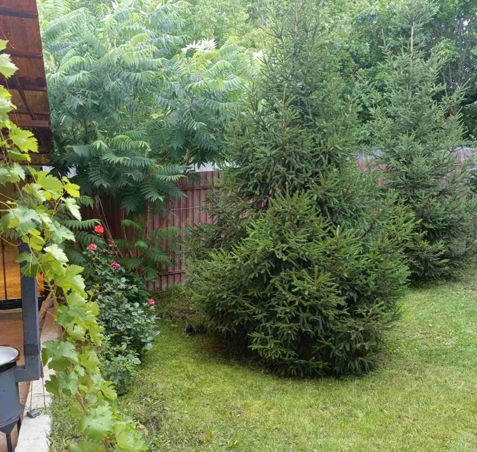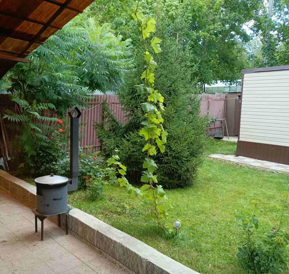 Во дворе сделан навес с зоной барбекю. Газонная травка, елочки.