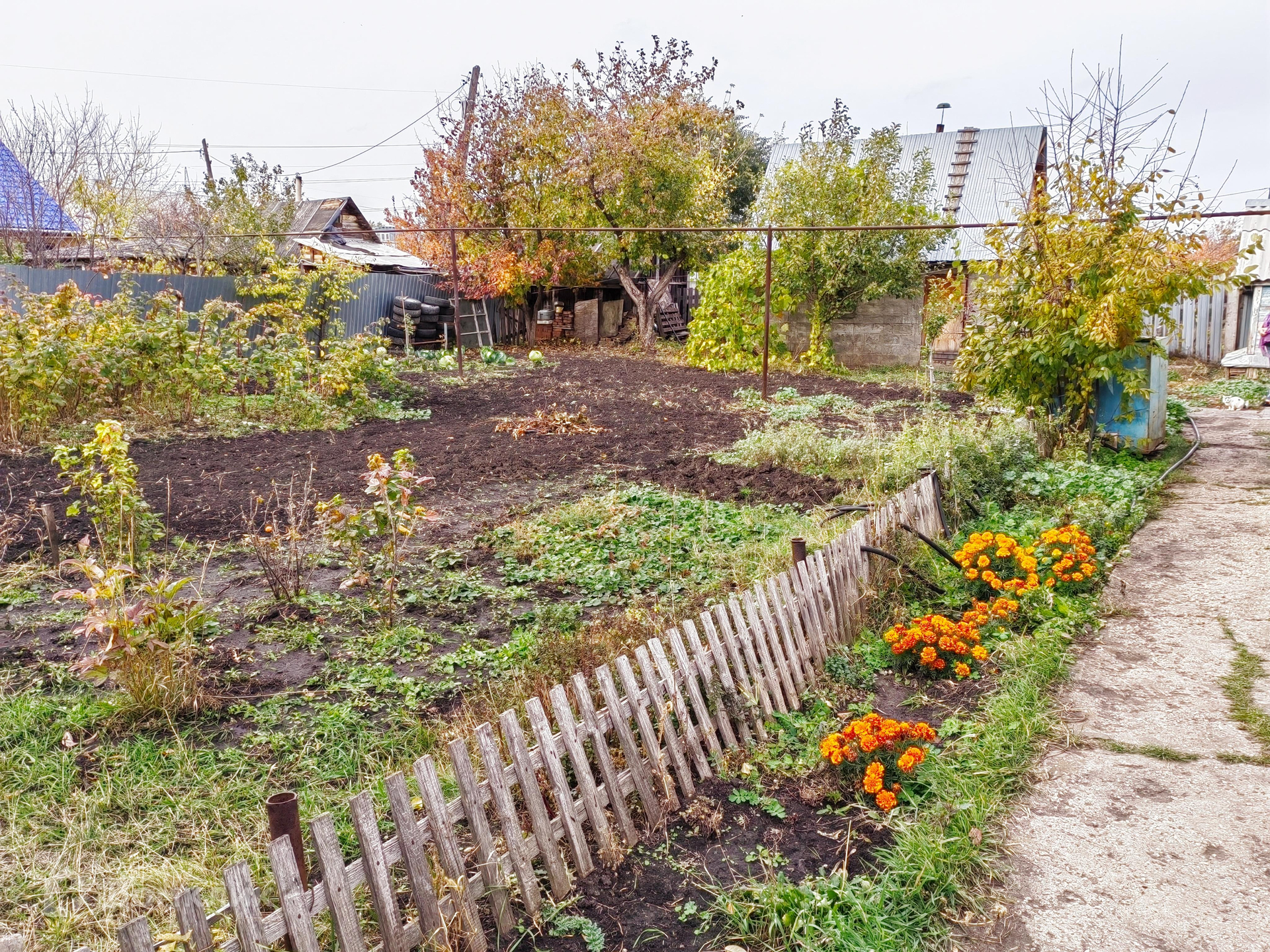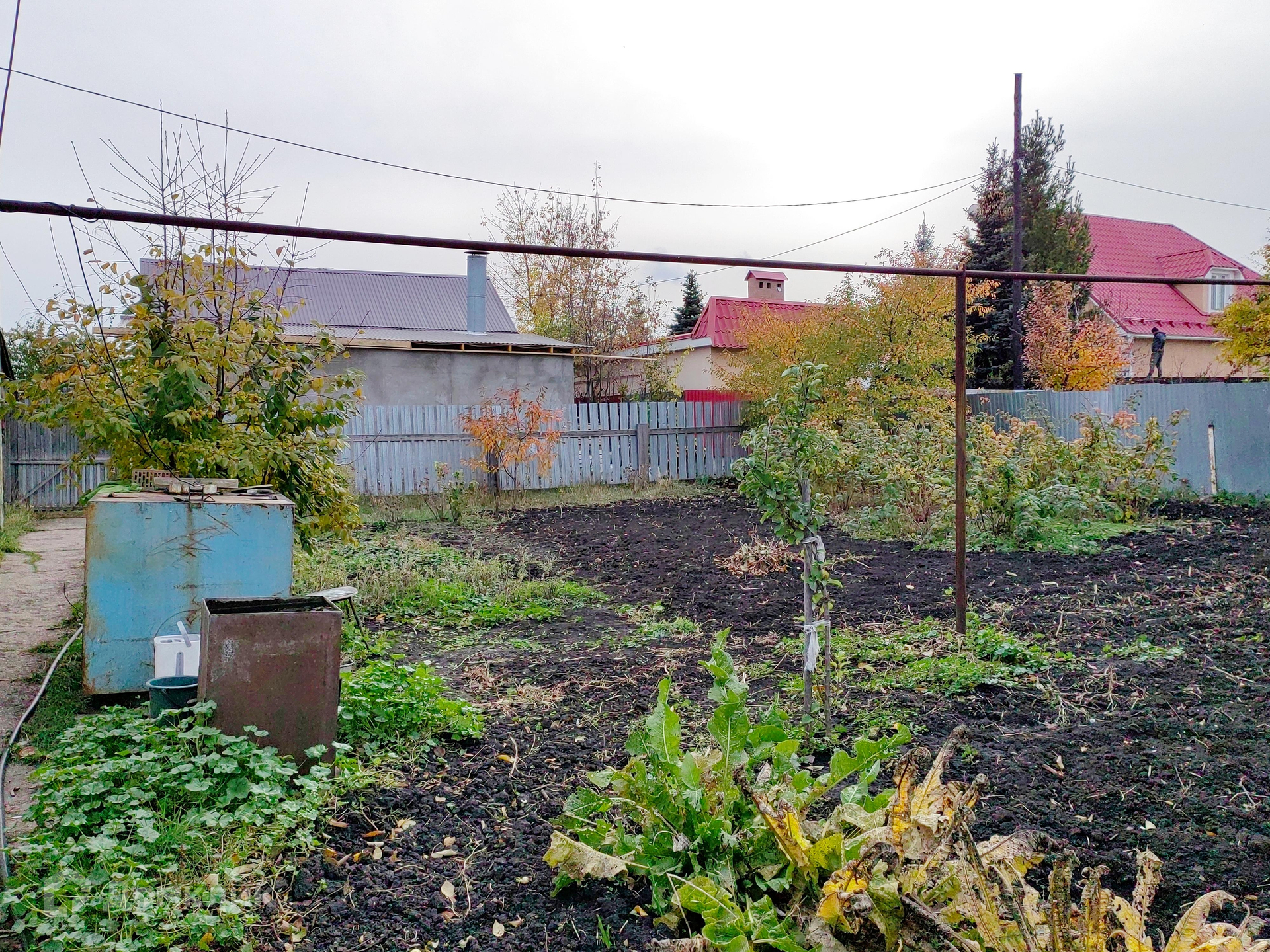 Ухоженный участок обнесен забором, есть плодовые деревья и насаждения.