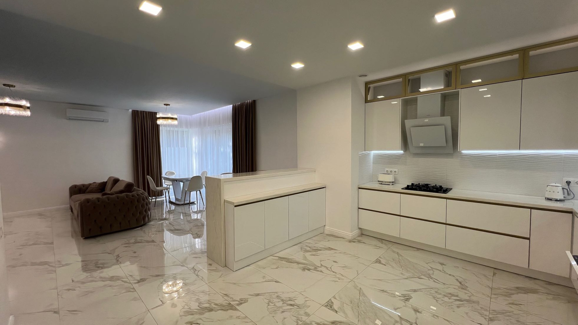 - Кухня полностью укомплектована встроенной техникой(духовой шкаф, микроволновая печь, плита, 5-ступенчатый фильтр для воды системы осмос, посудомоечная машина)