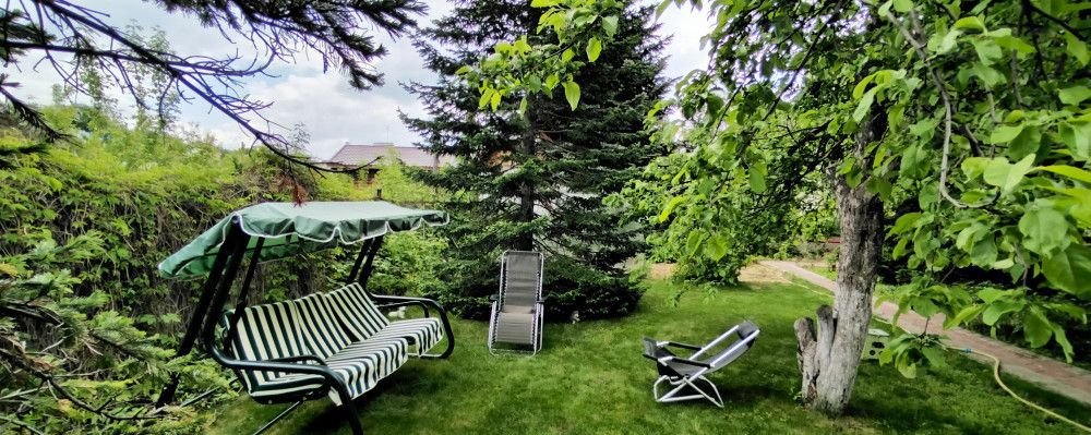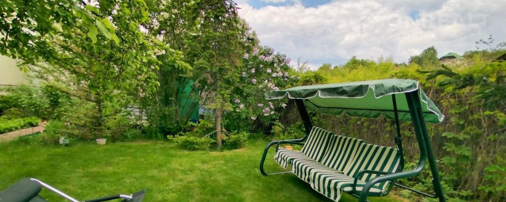 Участок прямоугольный, ровный, с декоративными и плодовыми деревьями и кустарниками. На участке построен хозблок и теплица.