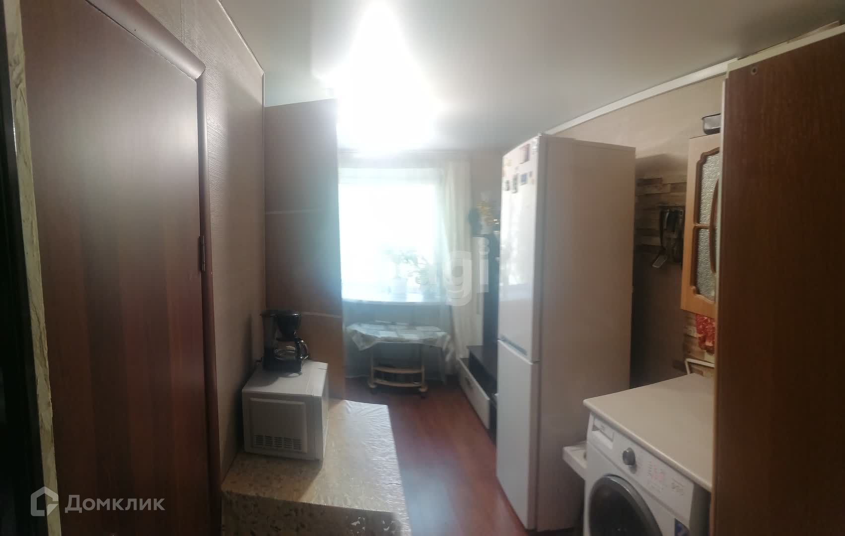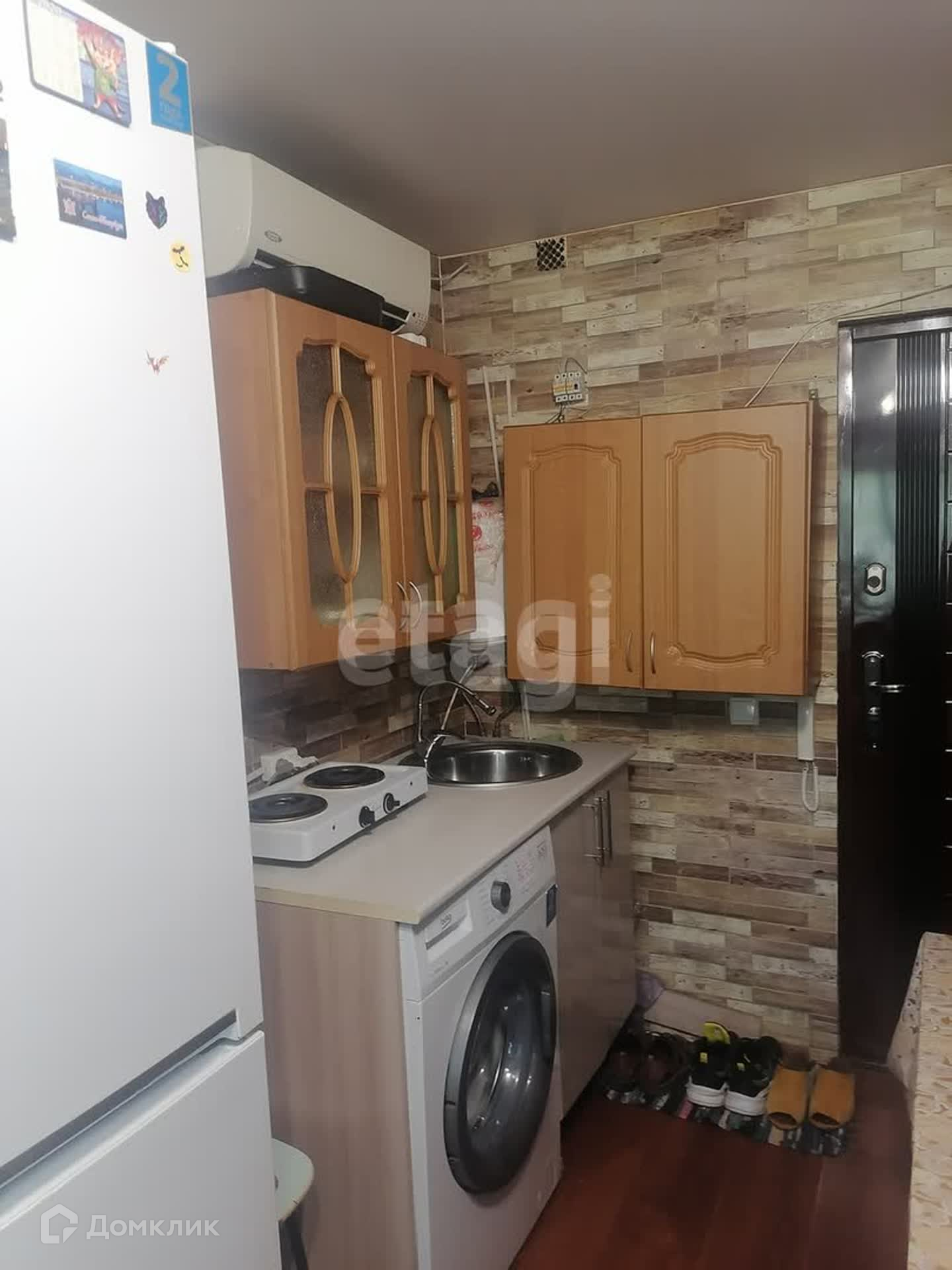 Справа кухня: из 2-х напольных предметов: разделочный стол-тумба, где выделено место под стиральную машину и 2-х комфортная электросвязи-плита, вторая напольная тумба для хранения + врезана раковина со смесителем и подведена вода(водоотведение узаконено!!!), над раковиной висит водонагреватель на 15 литров, над напольными элементами висят подвижные шкафы для хранения.