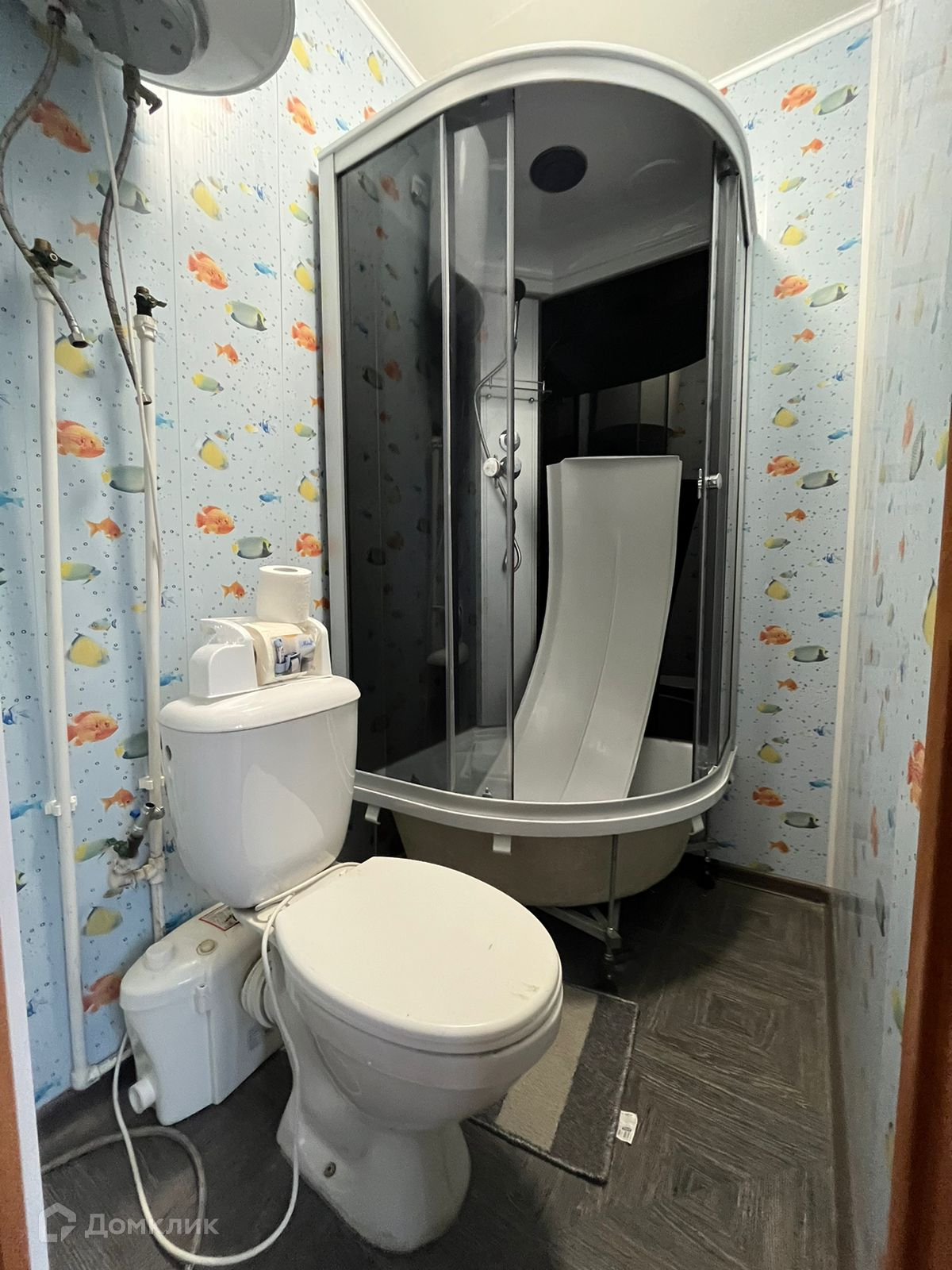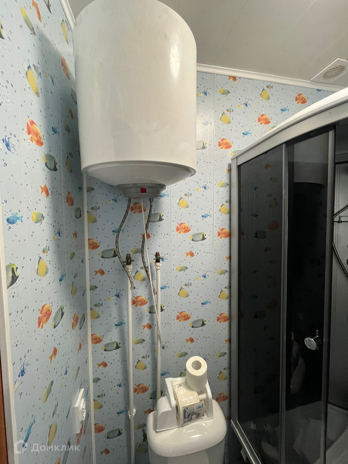 Современная сантехника, включая душевую кабину и водонагреватель.