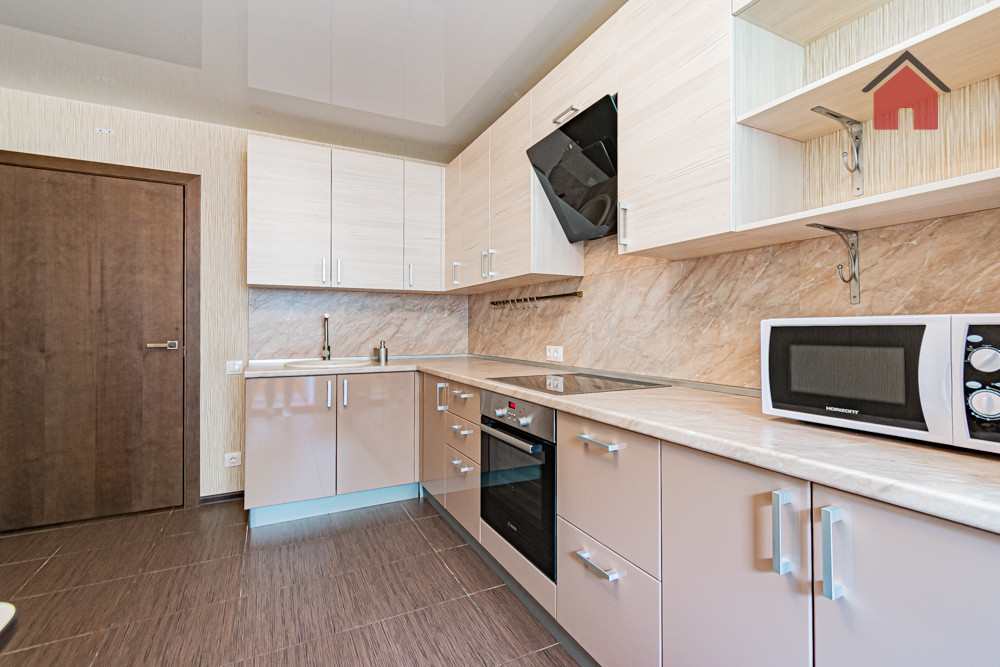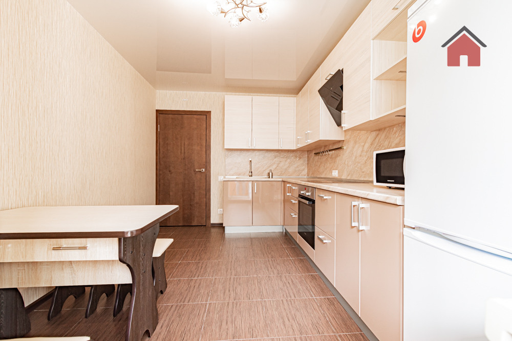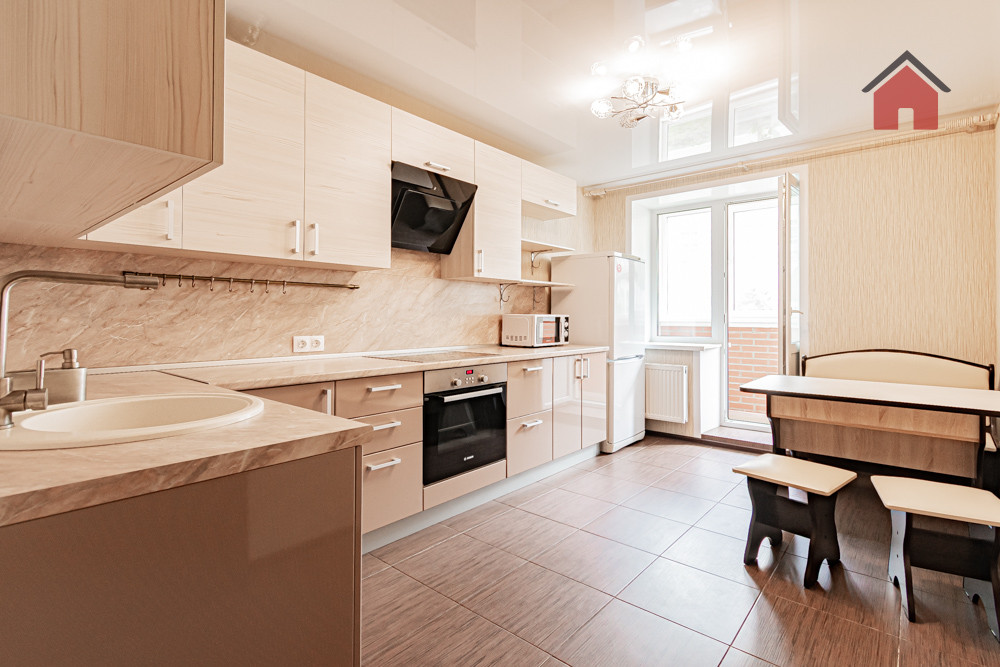 - Большая кухня с выполненным под заказ кухонным гарнитуром, жилая комната просторная, светлая, меблирована.