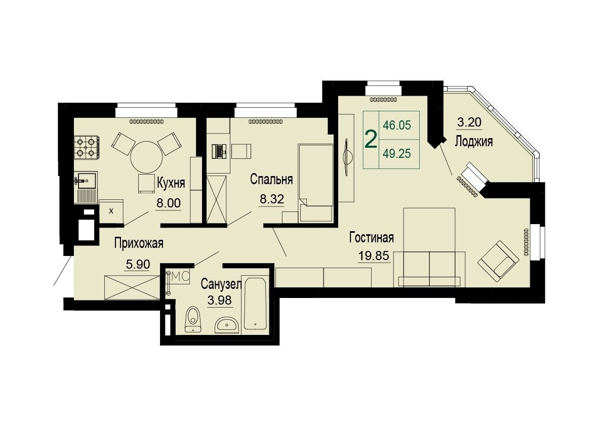 Количество комнат 2