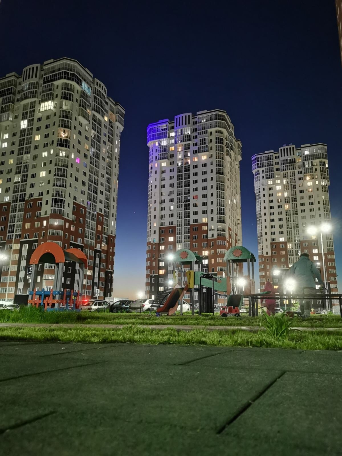Во дворе детская площадка, закрытая спортивная площадка, много места для парковки.