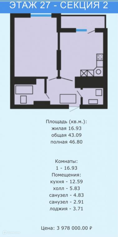 1-комнатная квартира, 46.8 м2, этаж 27 / 32, на продажу в Самаре, улица Антонова-Овсеенко, 63