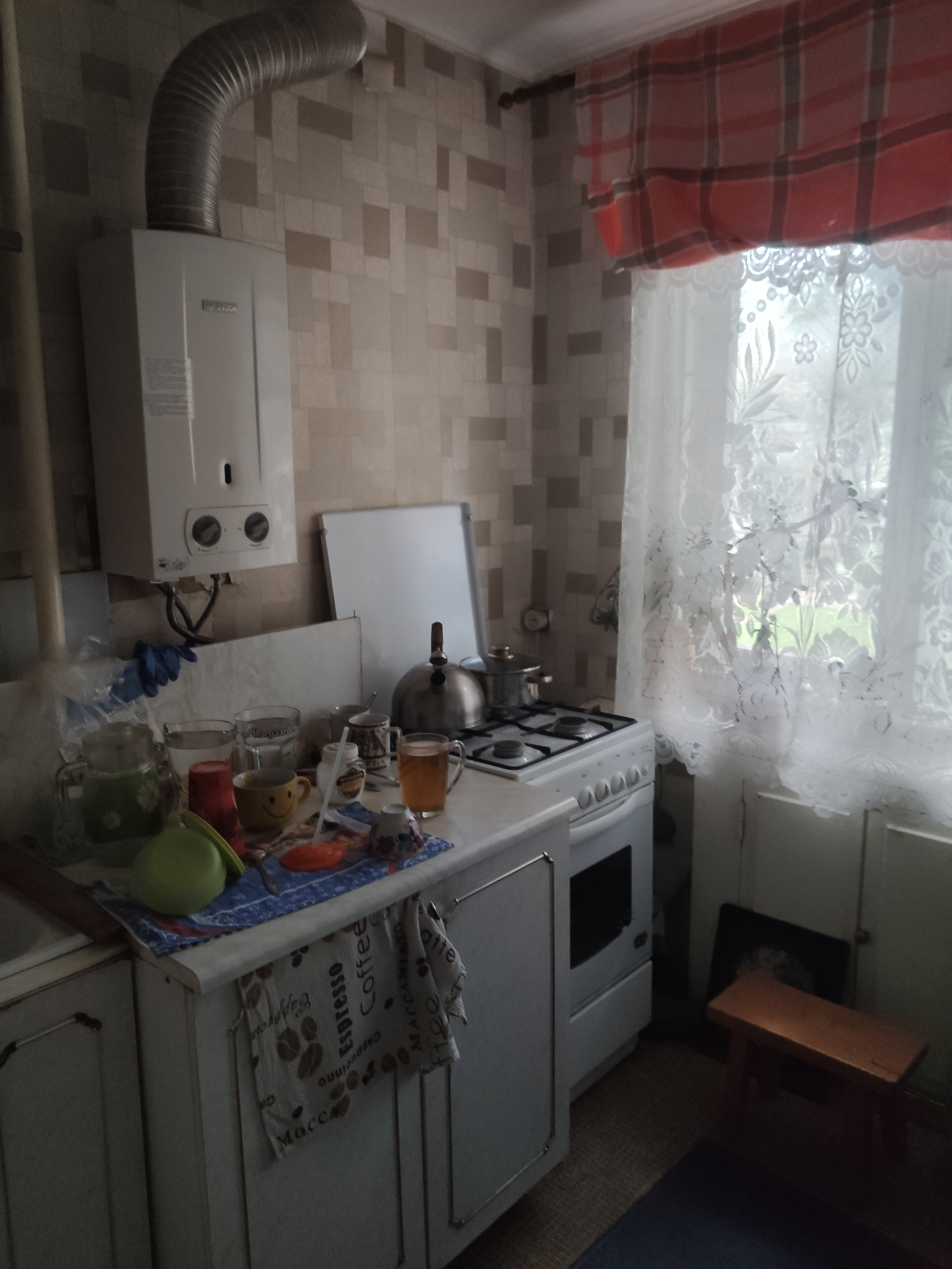 ! Оставляем кухню полностью: мебель, колонку, плиту, холодильник.