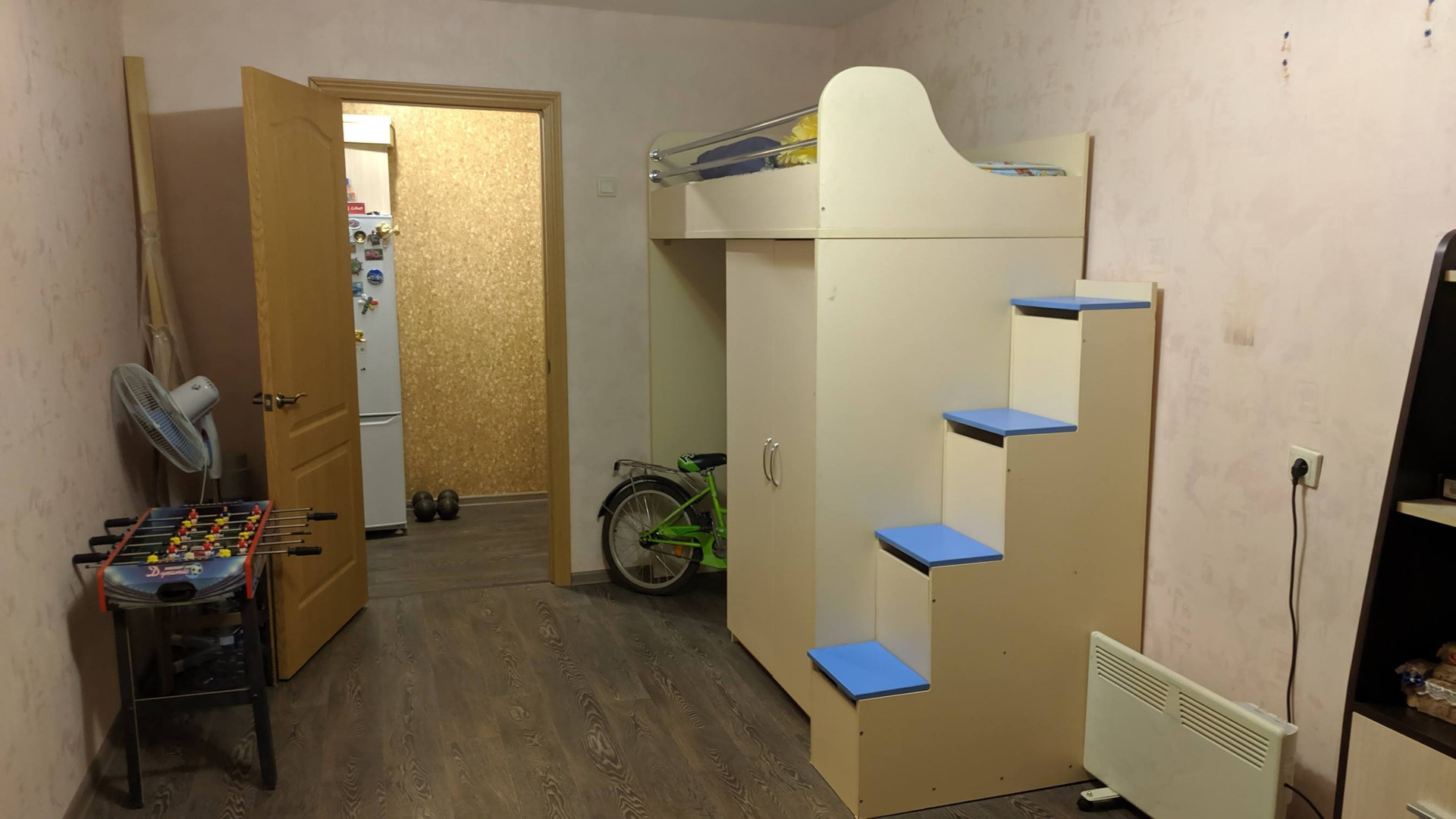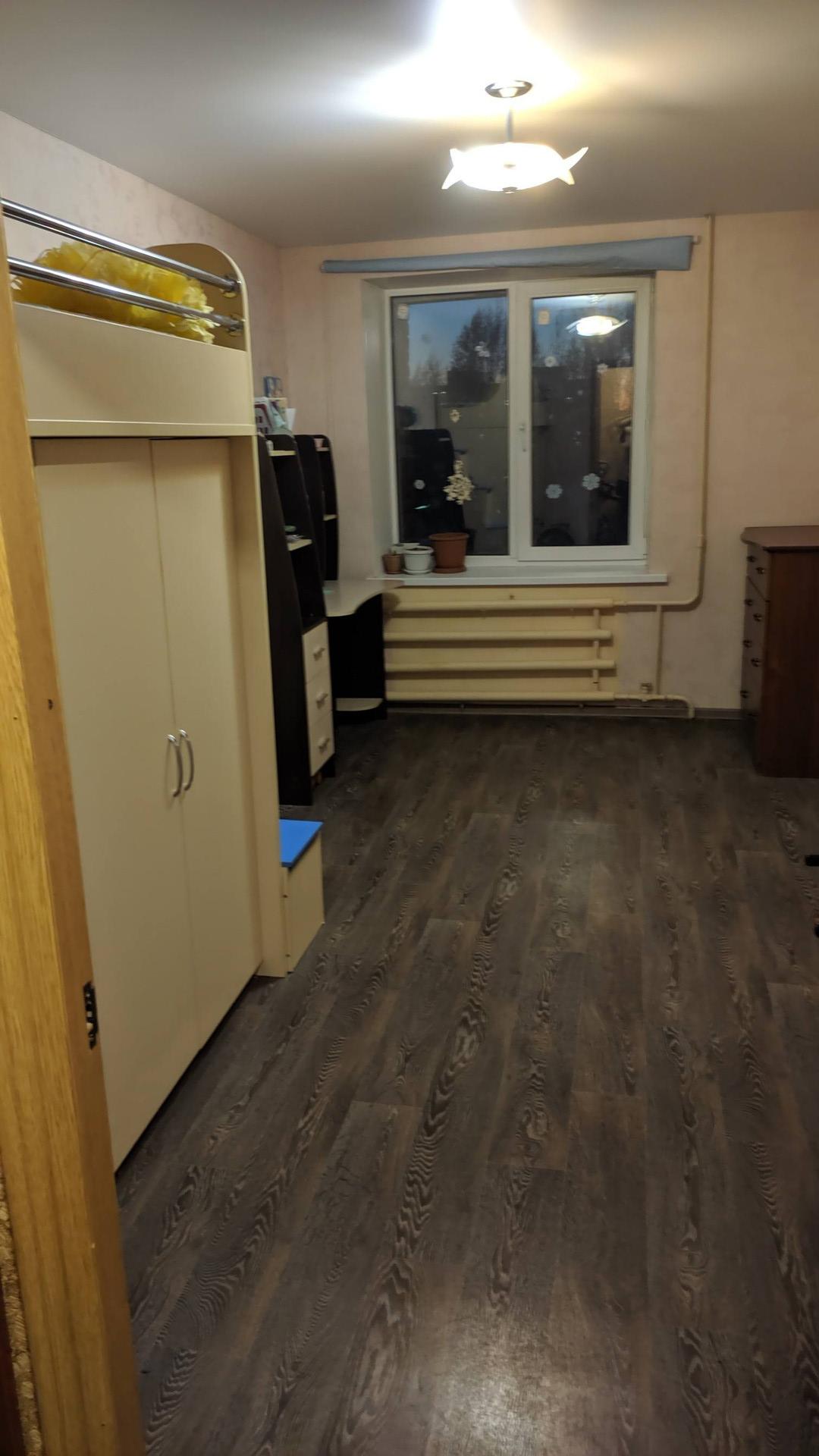 В квартире: две изолированные комнаты (13,8 и 13,2 м.кв.), большой коридор (9 м.кв.), просторный совмещенный санузел, кухонная зона. Окна выходят в тихий двор на школу. Остается большой шкаф-купе, диван, кухонный гарнитур, кондиционер, электроплита с духовкой, детская кровать-антресоль со шкафом.