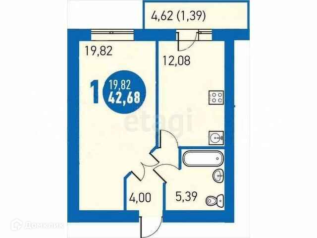 Общая площадь 42,68 кв. м. Комната площадью - 20 кв.м, кухня - 12 кв.м. Балкон застеклен, утеплен. Санузел совмещен - 5,4 кв.м.