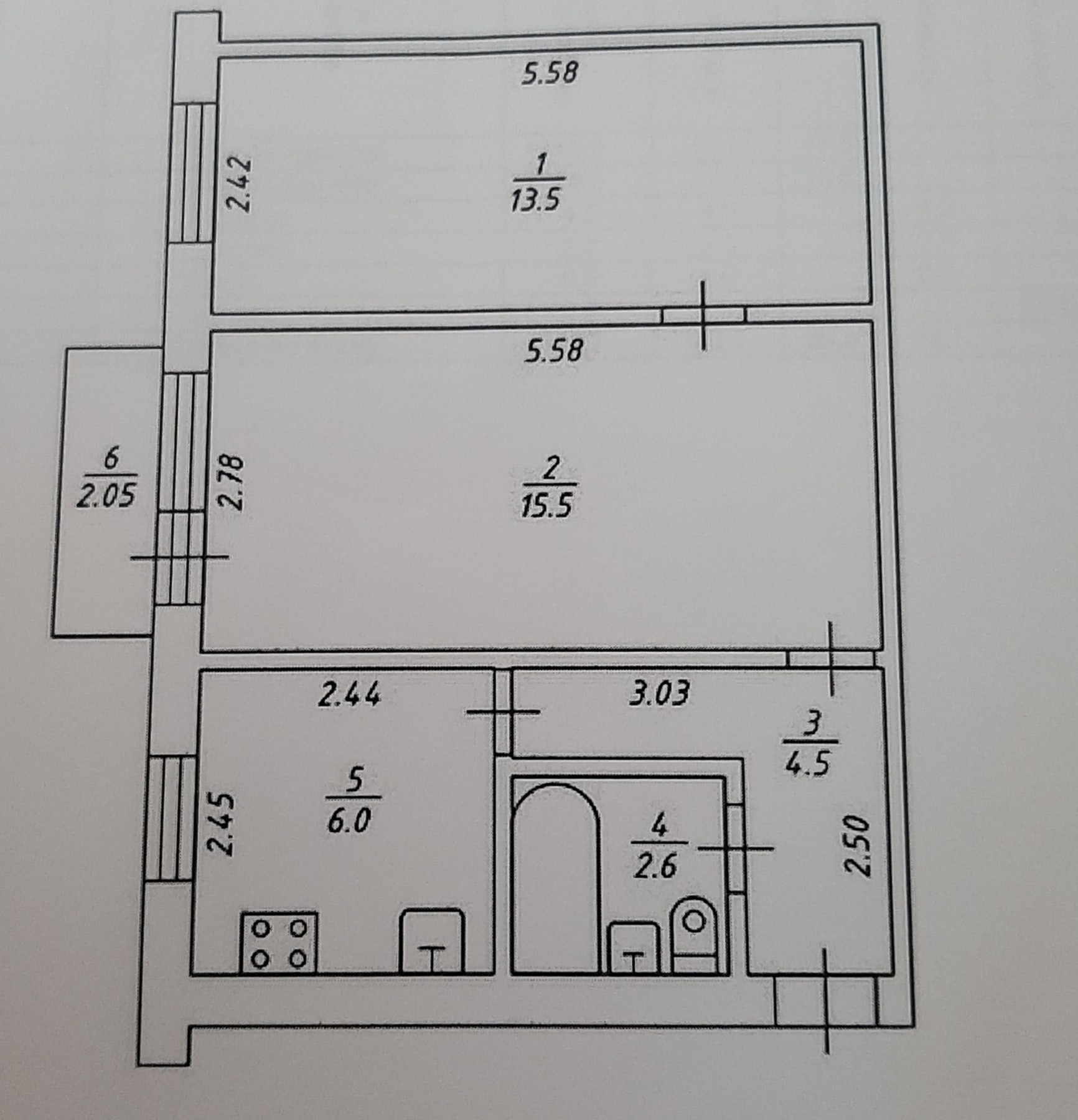комнаты 13,5+15,5 кв.м., кухня 6 кв.м.