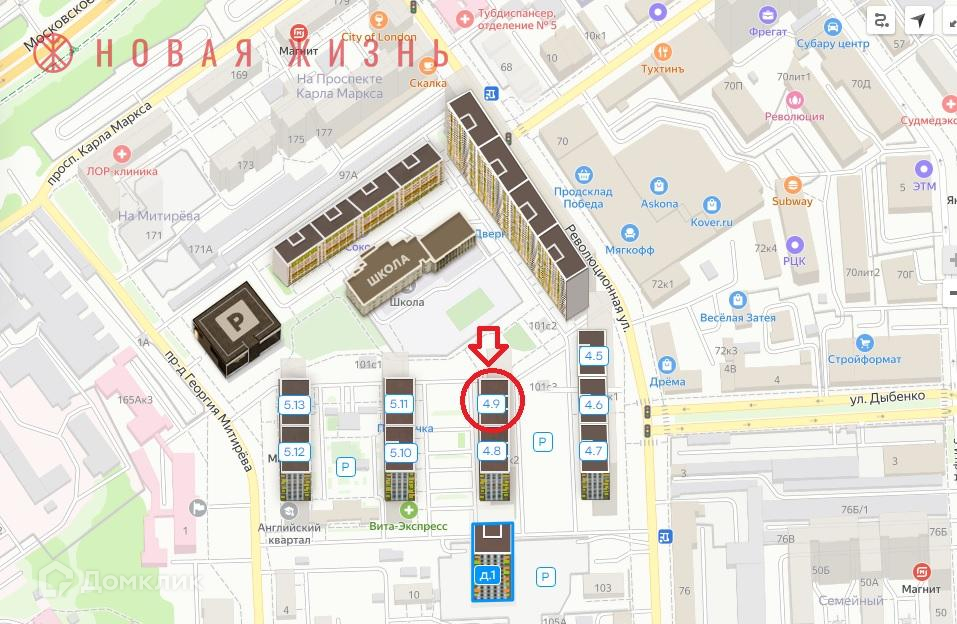 Расположен на пересечении улиц Революционная/Дыбенко, фактический адрес ул. Революционная 101В корпус 2