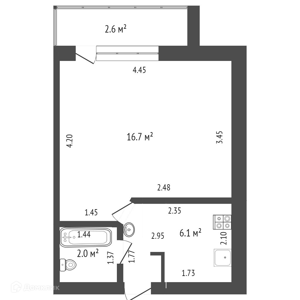 Общая площадь 25 кв.м. + лоджия 2 кв.м. Комната просторная 17 кв.м., своя полноценная кухня 4 кв.м.