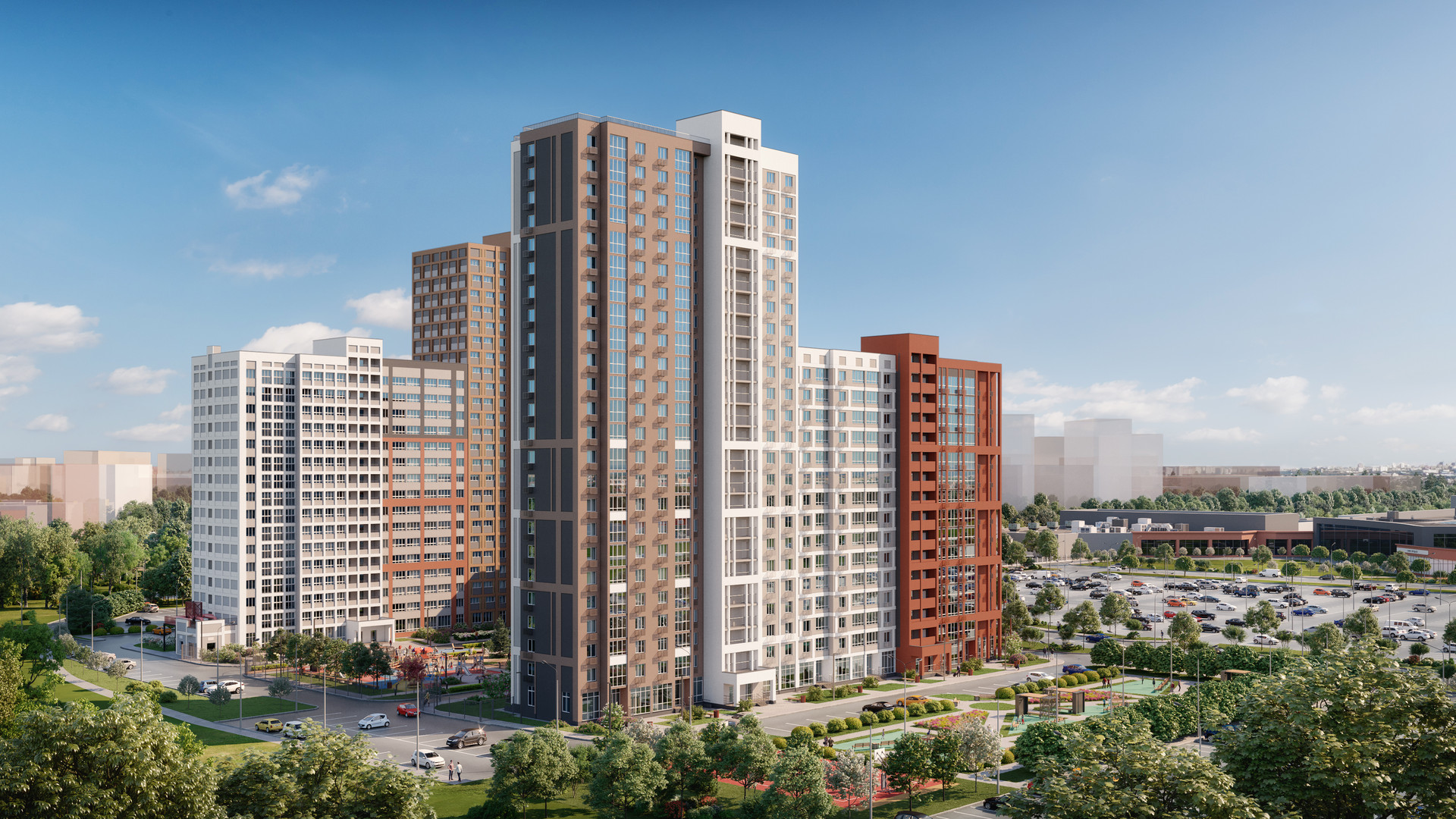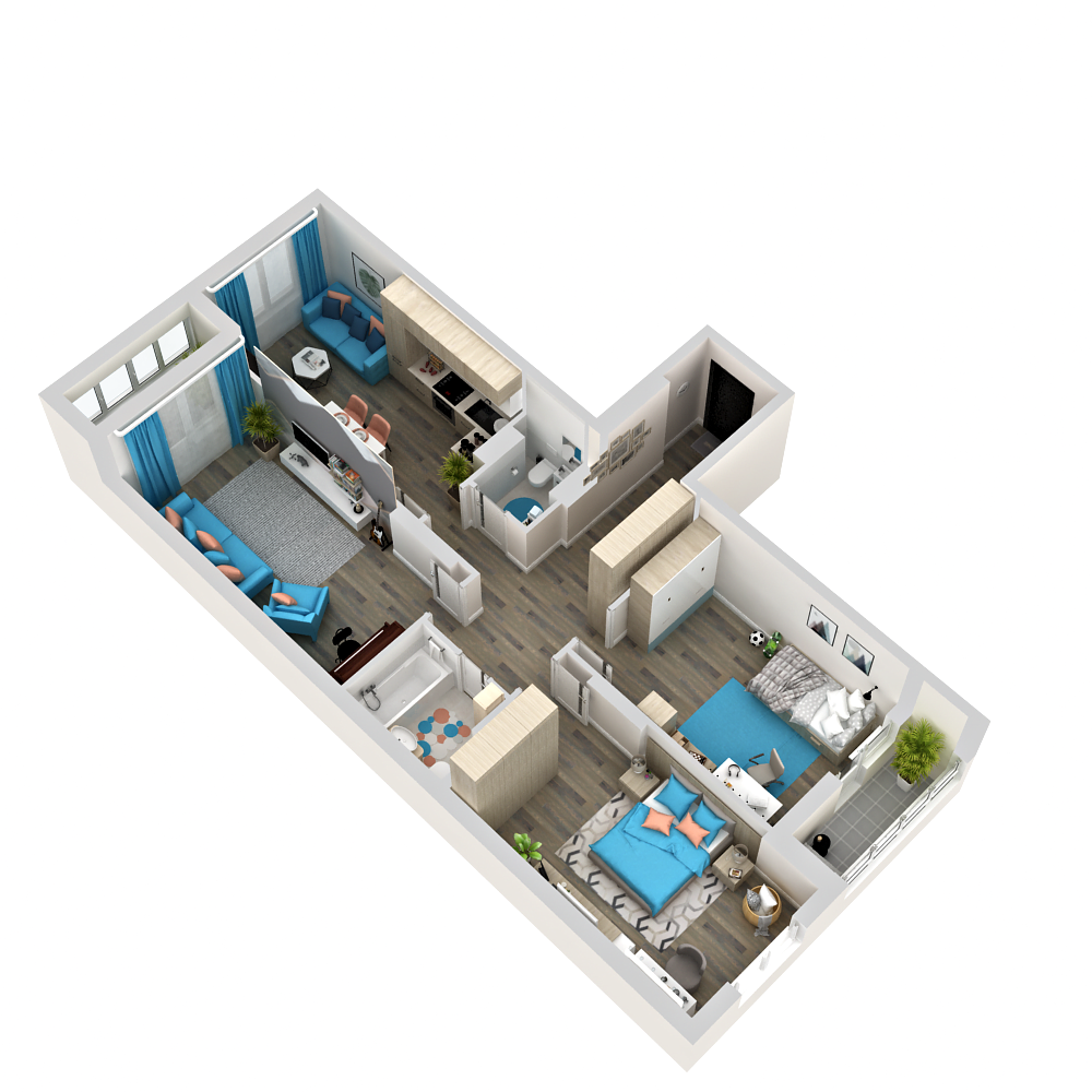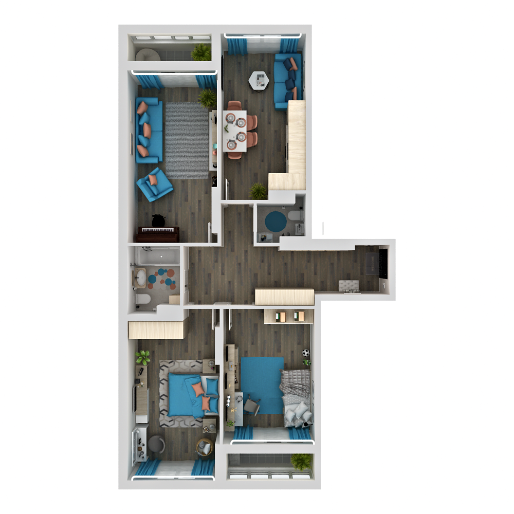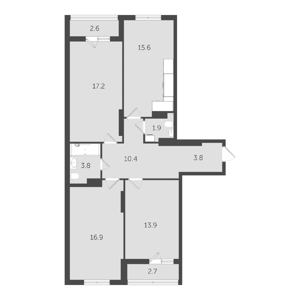 Большая 3-комнатная квартира с просторным холлом, двумя санузлами, кухней-гостиной и двумя лоджиями. В кухне-гостиной (15 кв.м) достаточно места для отдельной рабочей, обеденной и досуговой зоны.
