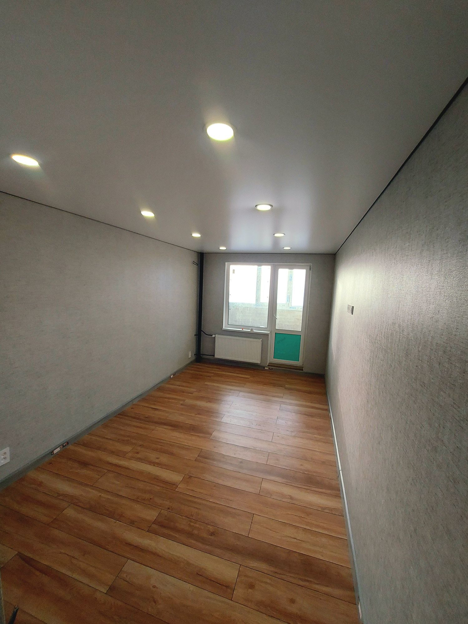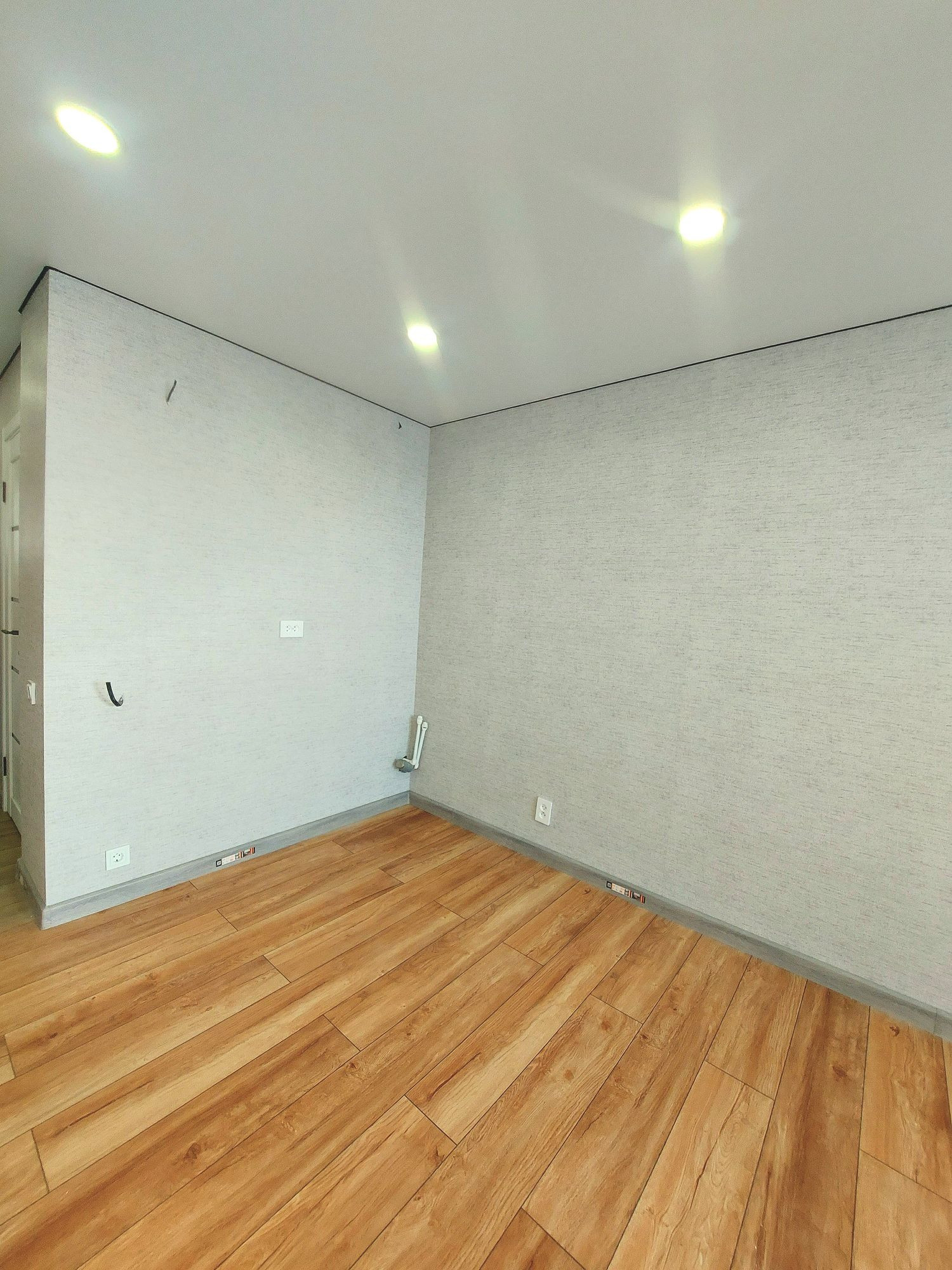 Выполнен качественный ремонт: на полу ламинат натурального оттенка, стены оклеины обоями, натяжной потолок с точечными раздельными светильниками, розетки под любые запросы, сан. узел в керамограните,выводы под мойку, стиралку, надежная 3-х петельная входная дверь, балкон с освещением.