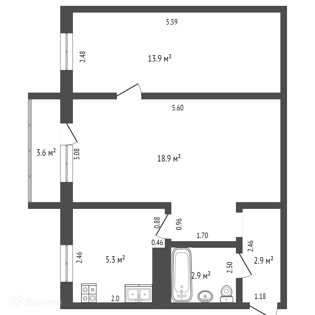 Общая площадь 43.9 м2