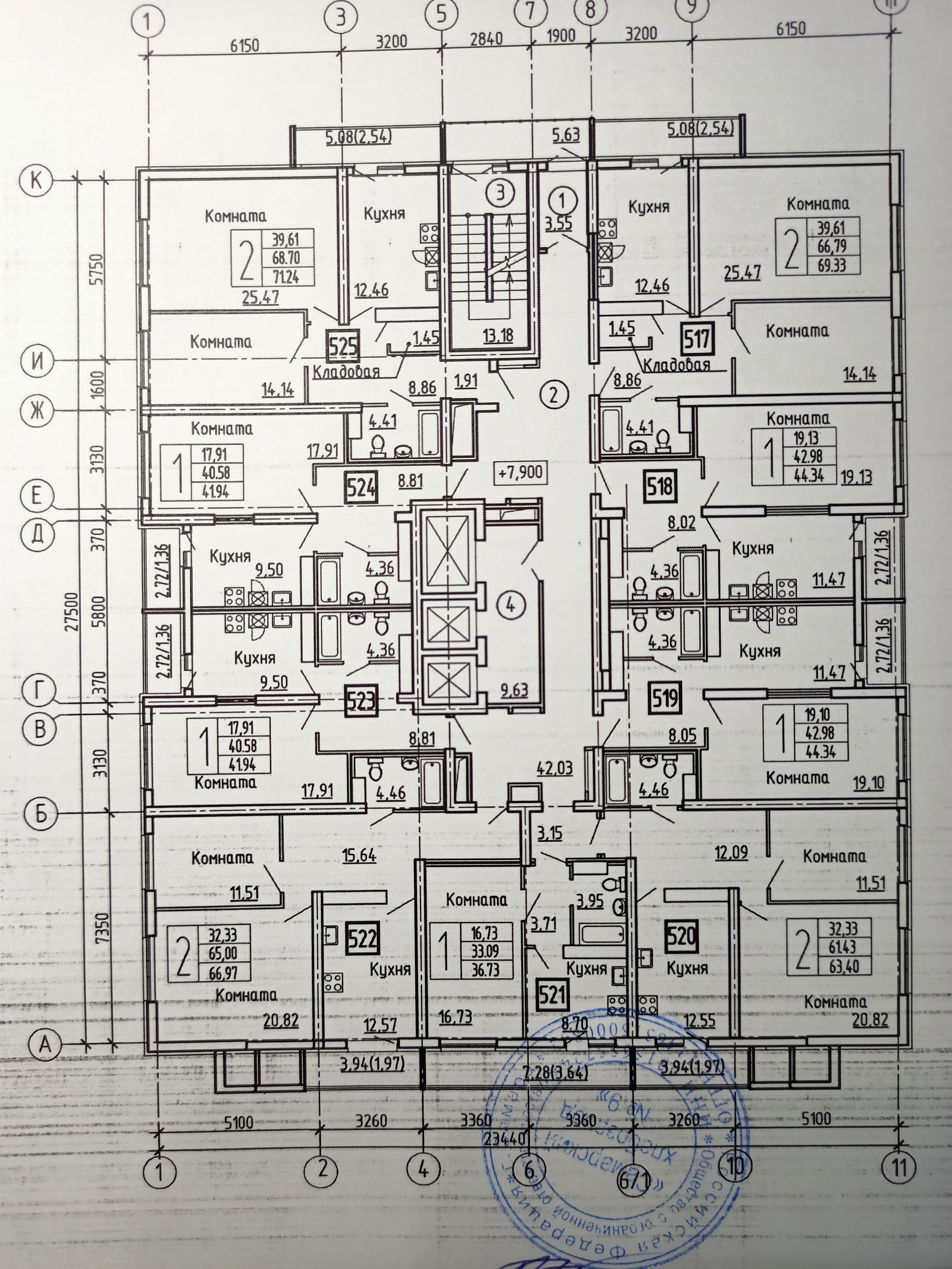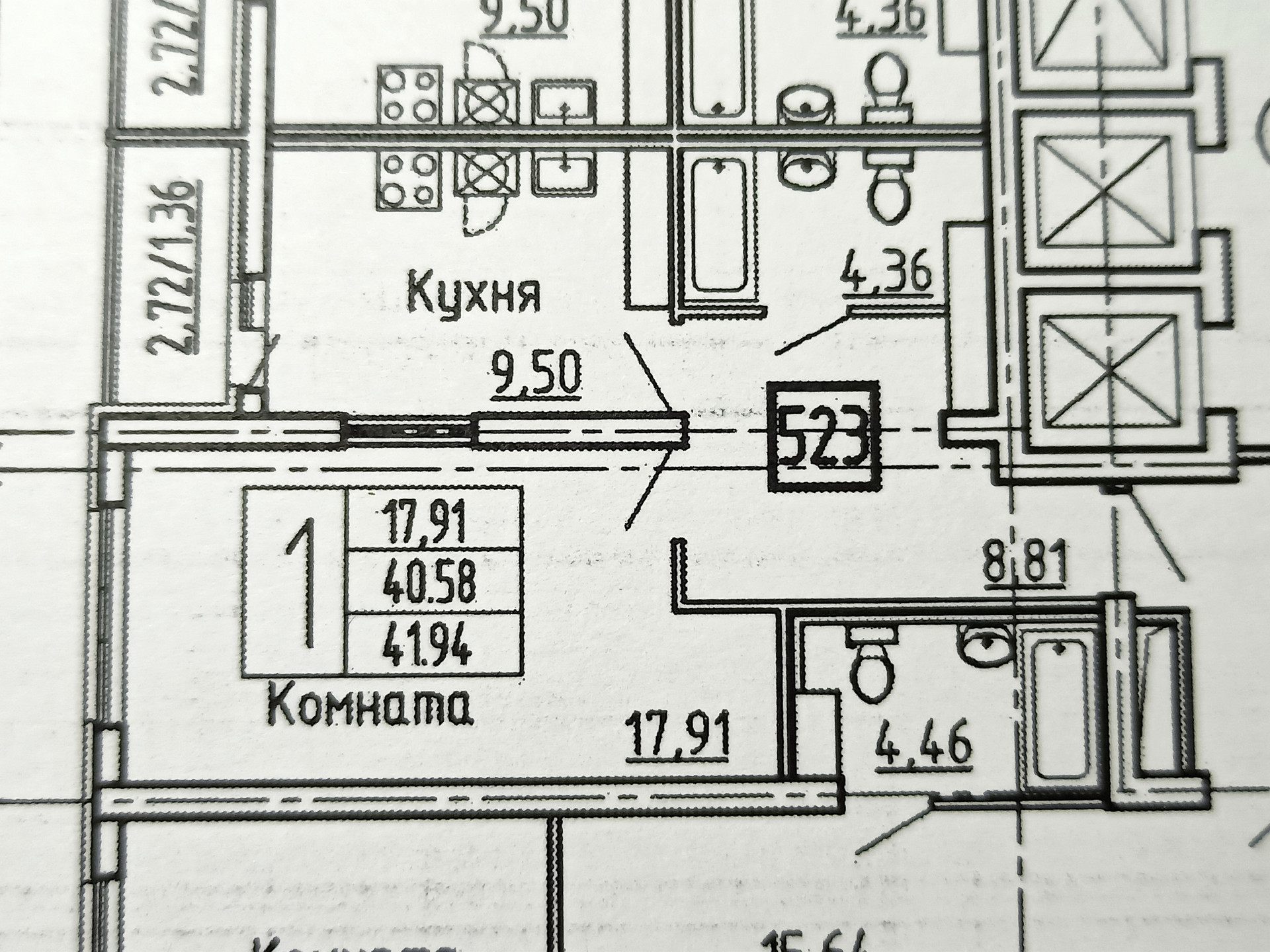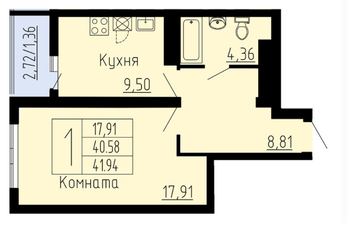 Большая кухня - 9,5 кв. м. , комната - 17,9 кв. м., коридор 8,81 кв. м . , лоджия - 2.72 кв. м., просторный совмещенный сан. узел - 4,36 кв. м.