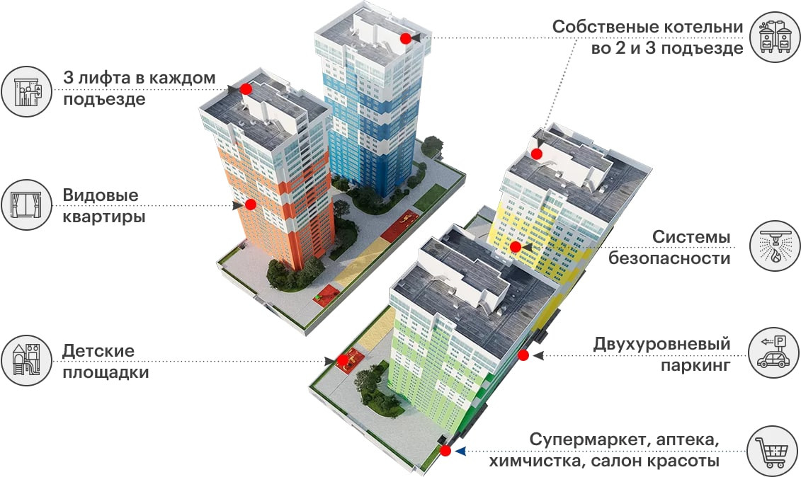 ✅ Двухуровневый подземный паркинг на 237 машиномест с доступом к лифту. Концепция "двор без машин", прогулочная зона, детские и спортивные площадки.