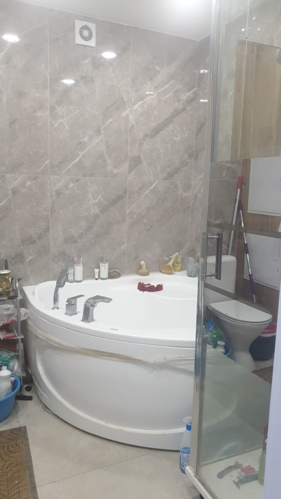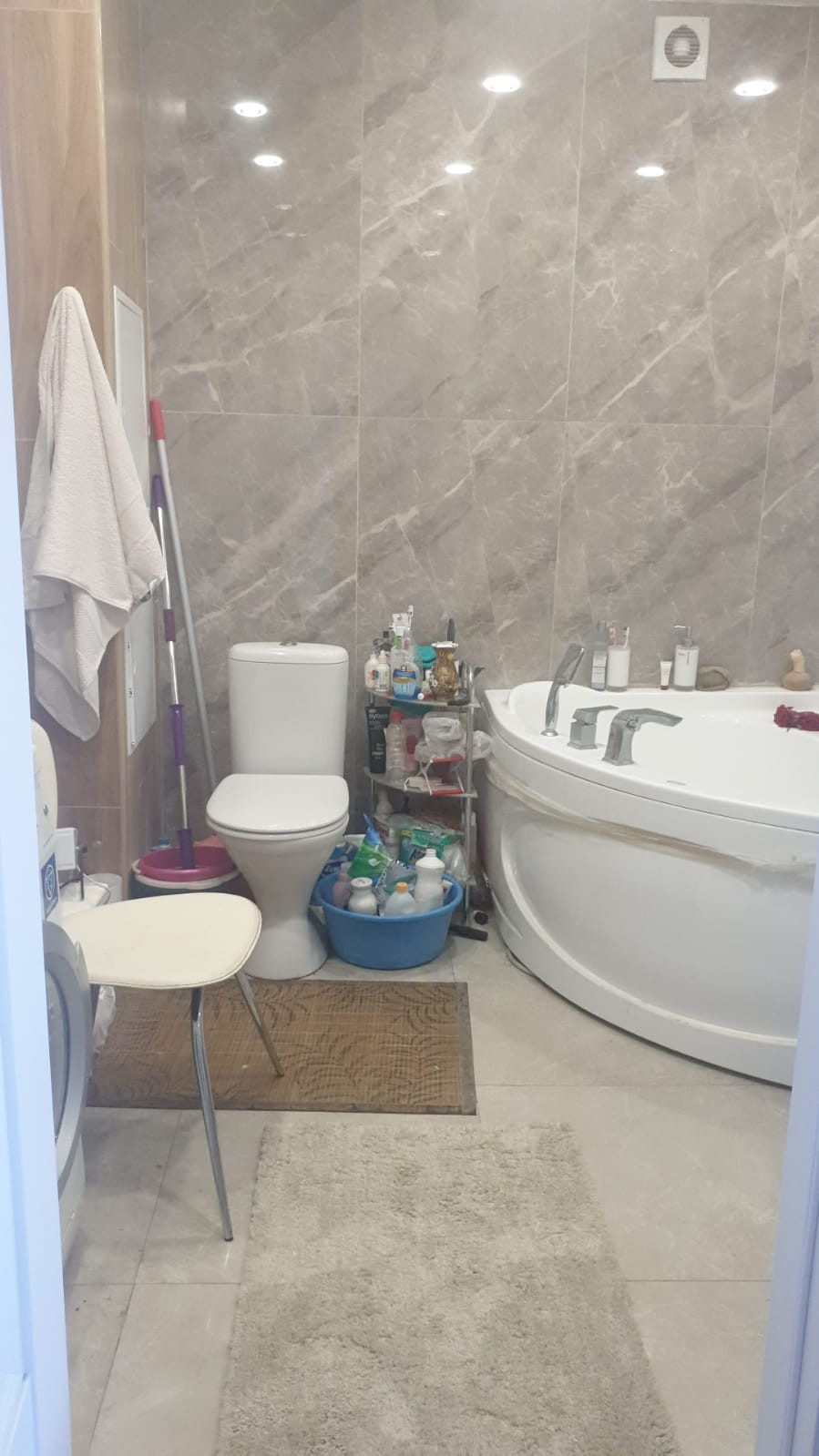 6 кв. м., угловая ванна и душевая кабина с каменным днищем.