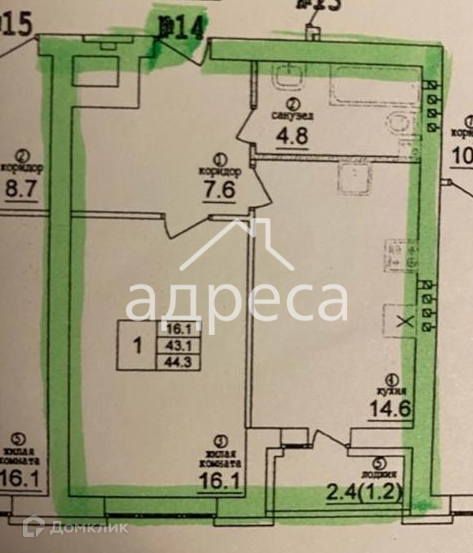 Общая площадь 43.3 м2