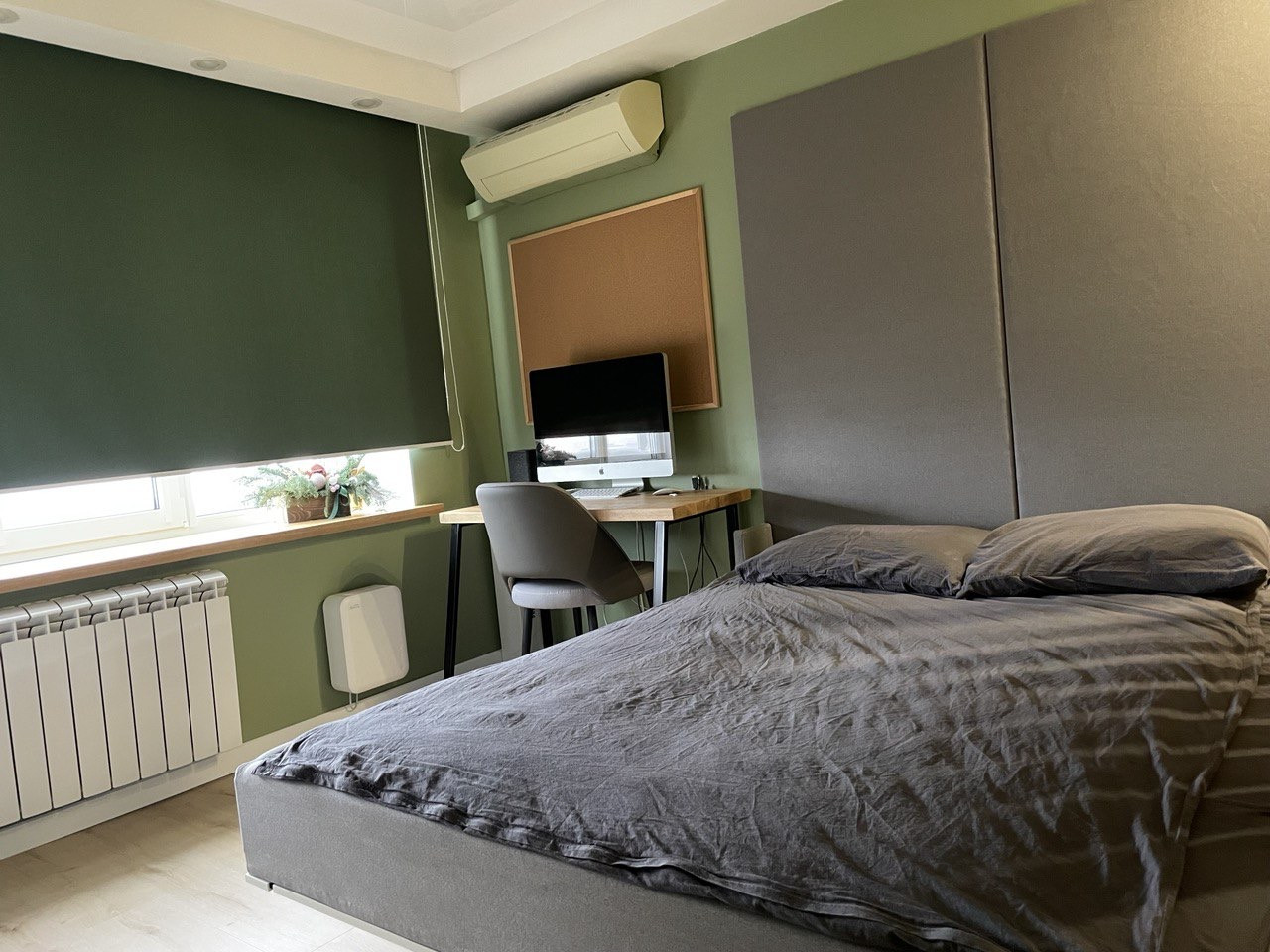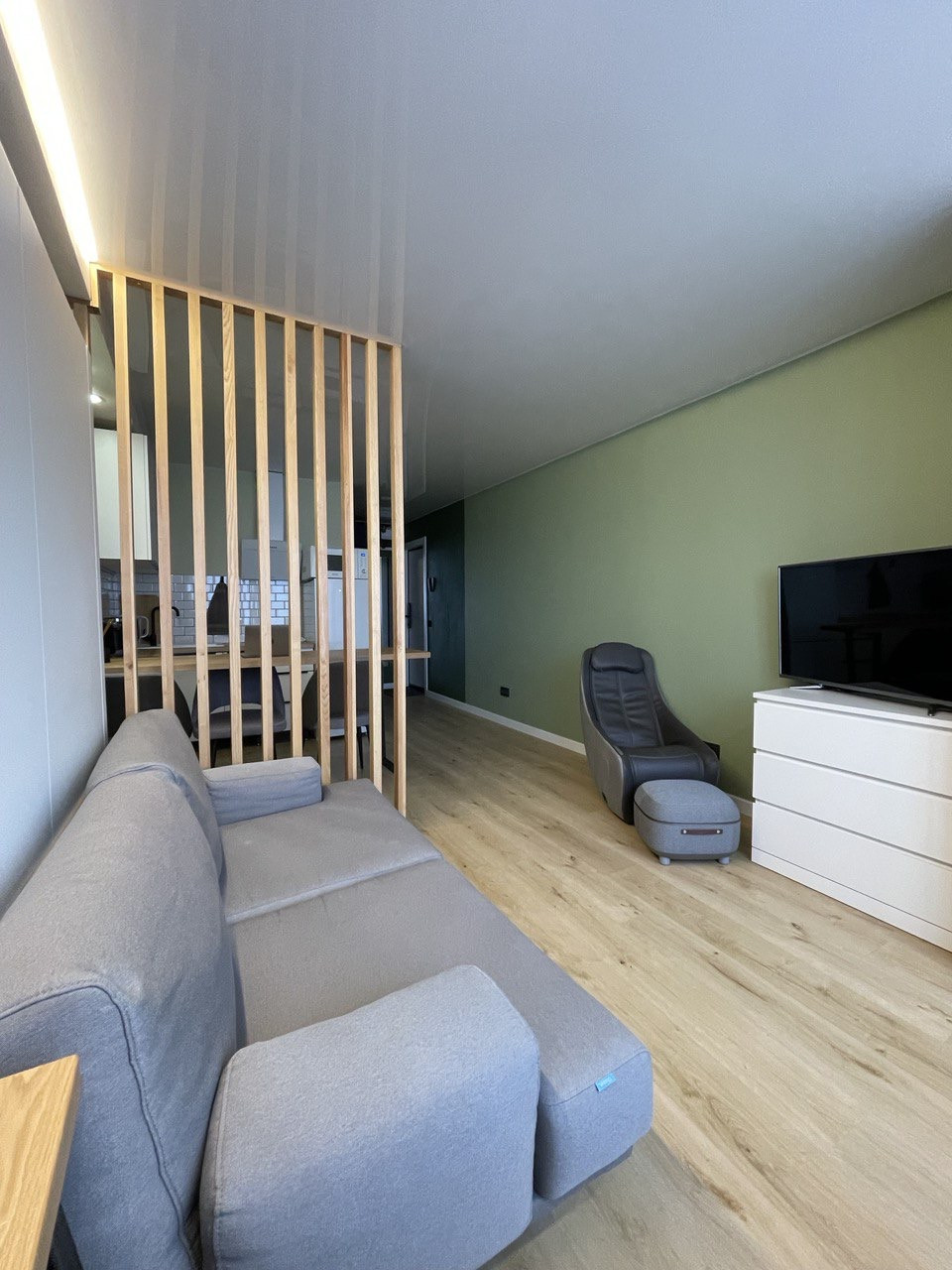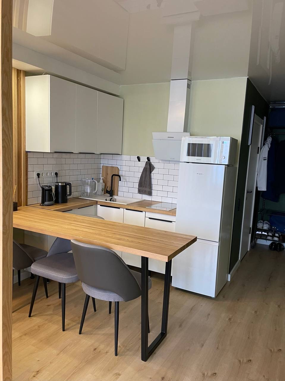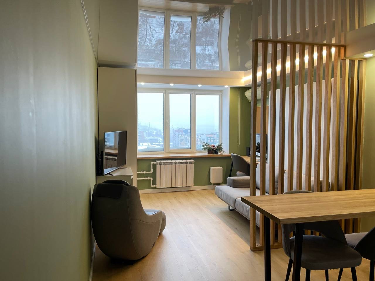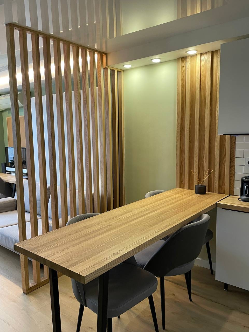 - в интерьере много теплого натурального дерева: подоконник, столешница, перегородка,