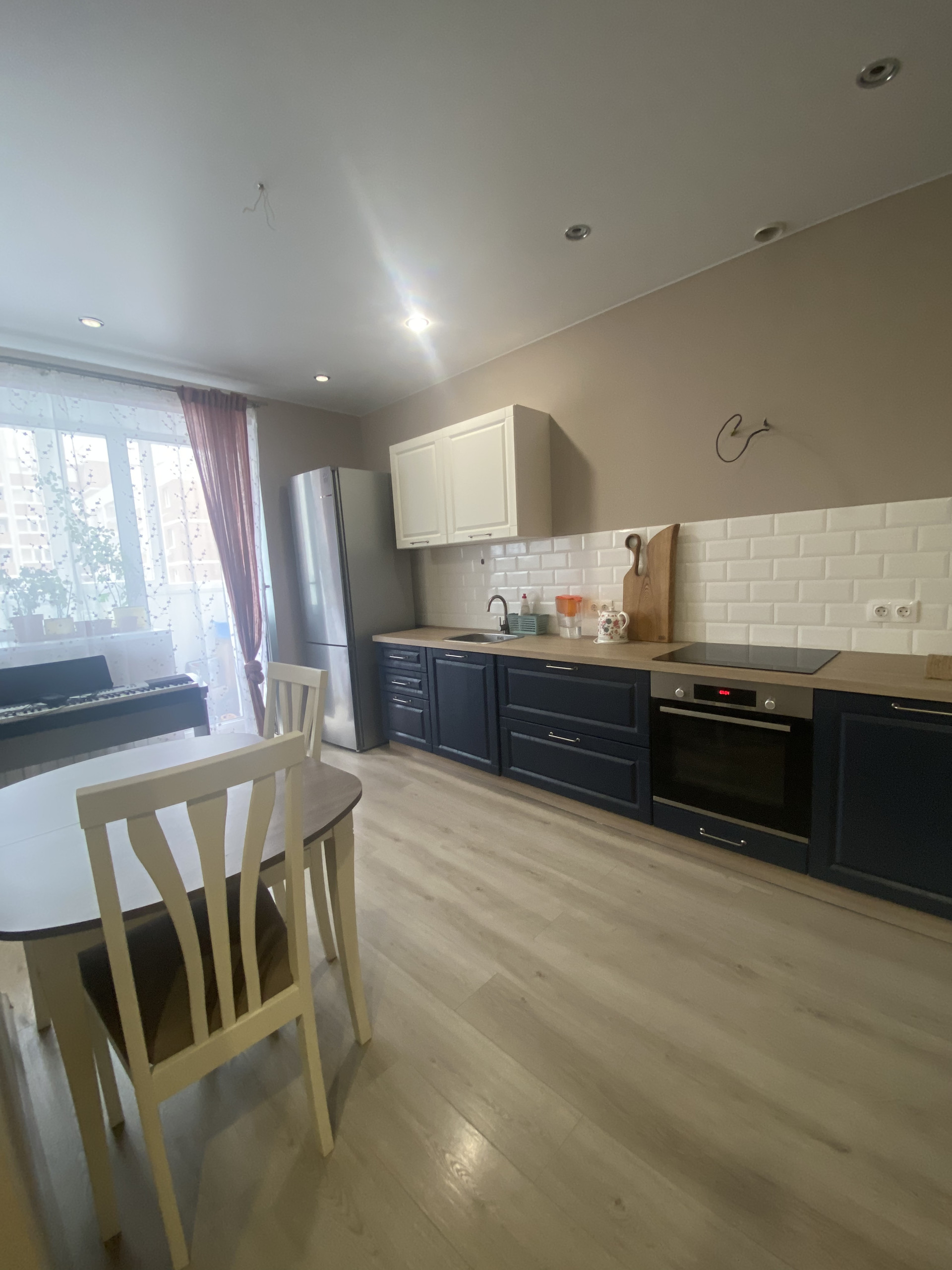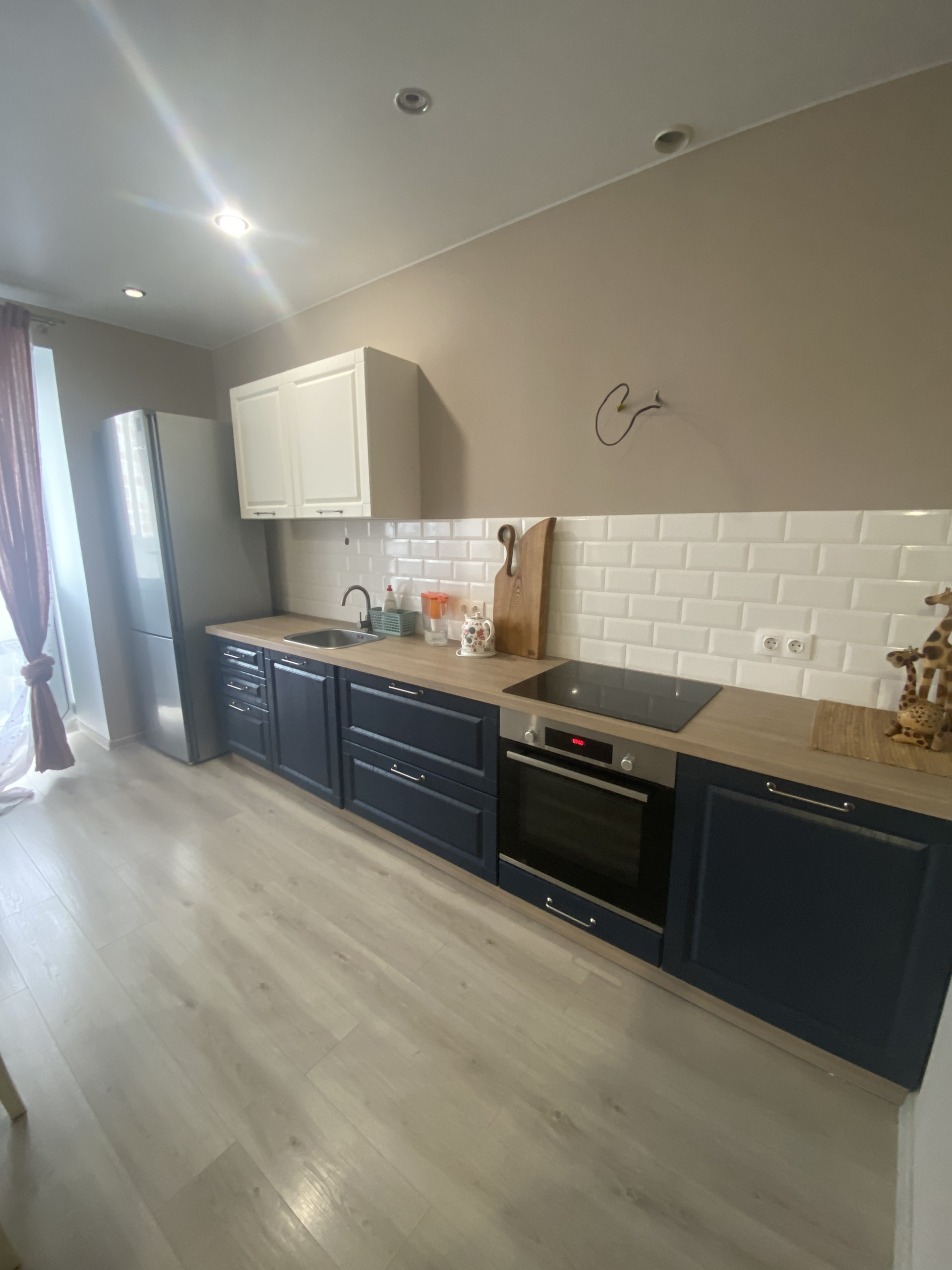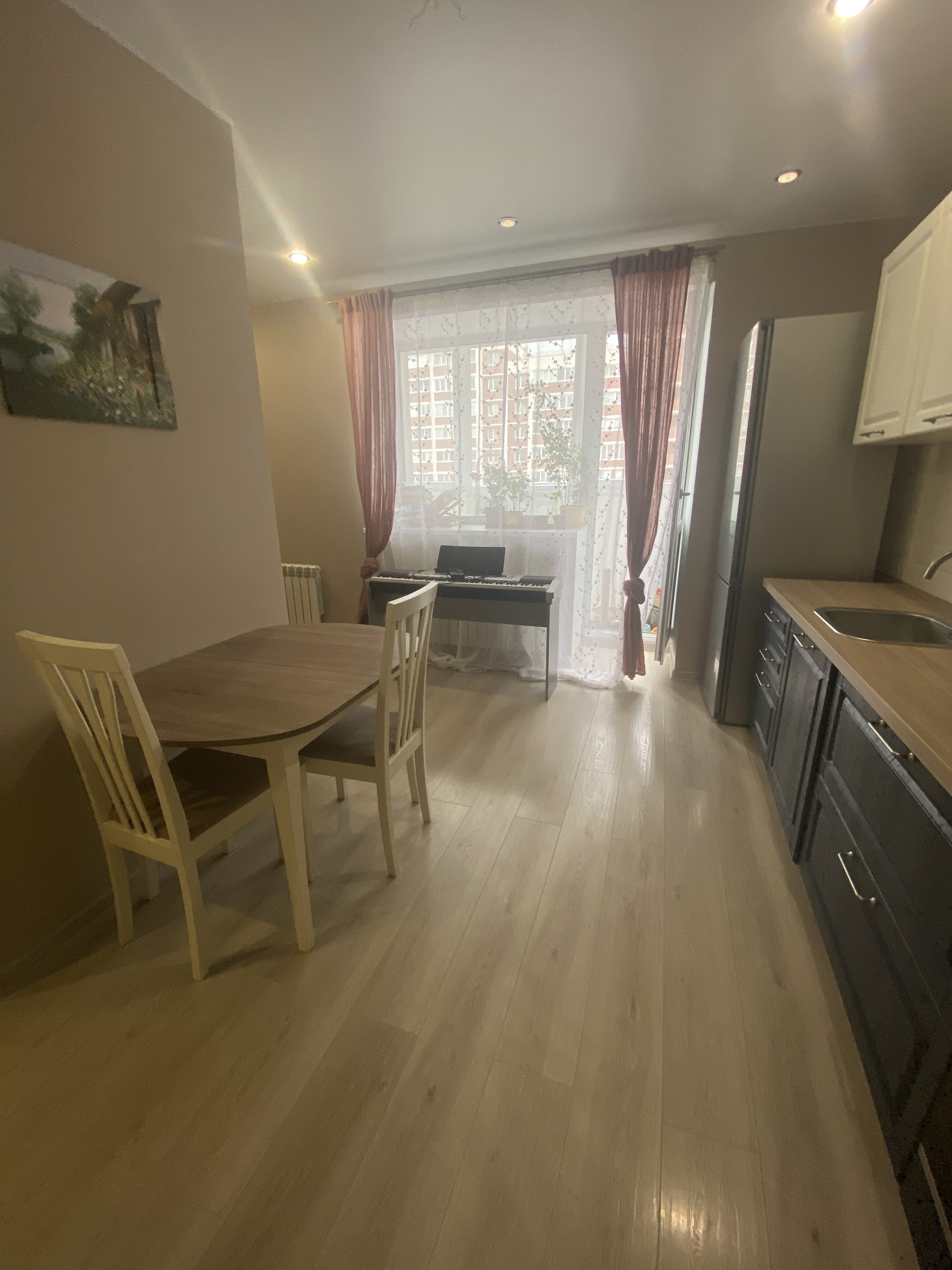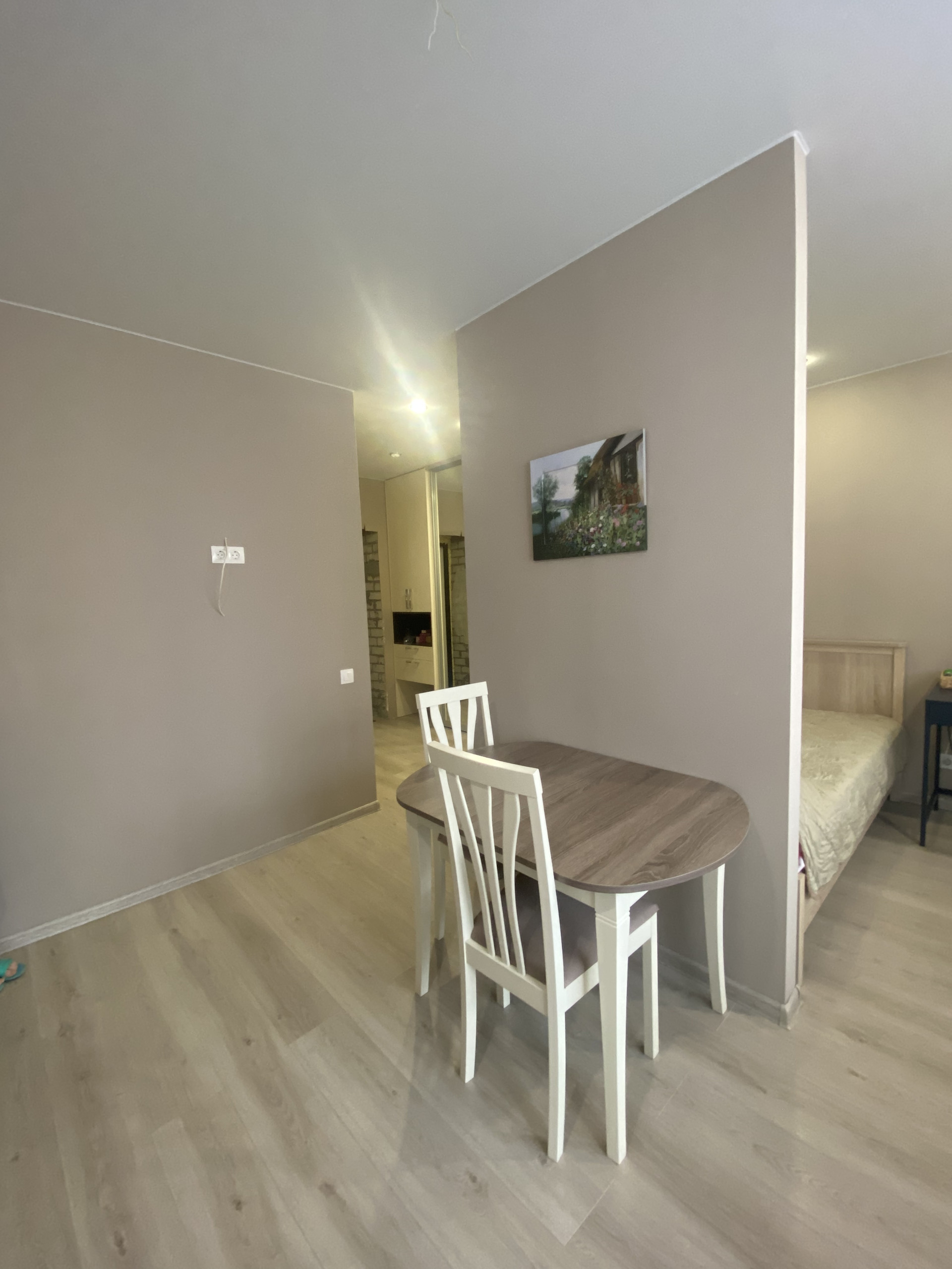 Лоджия застекления, просторная кухня-гостиная, выделенная зона спальни,просторный коридор.