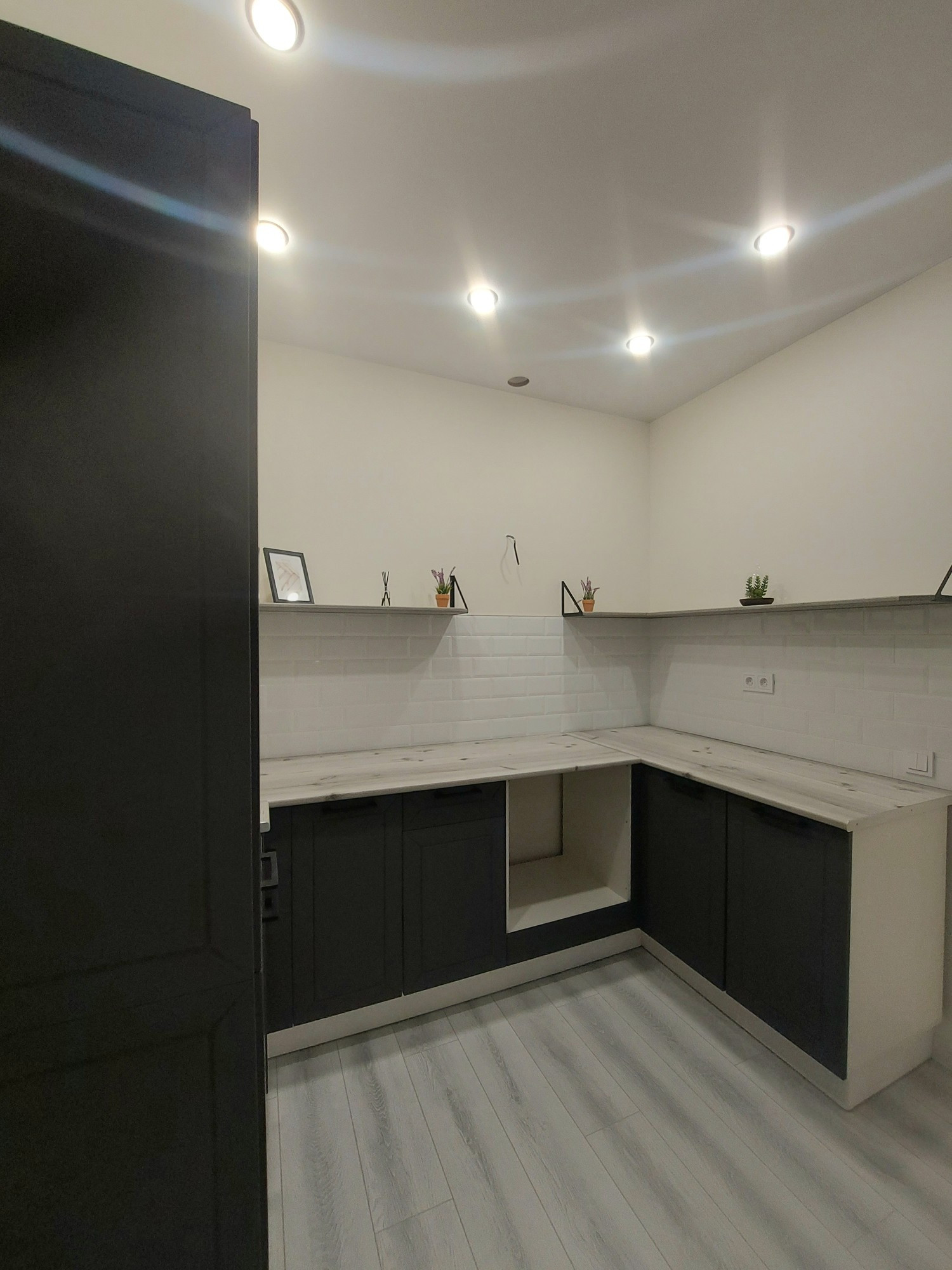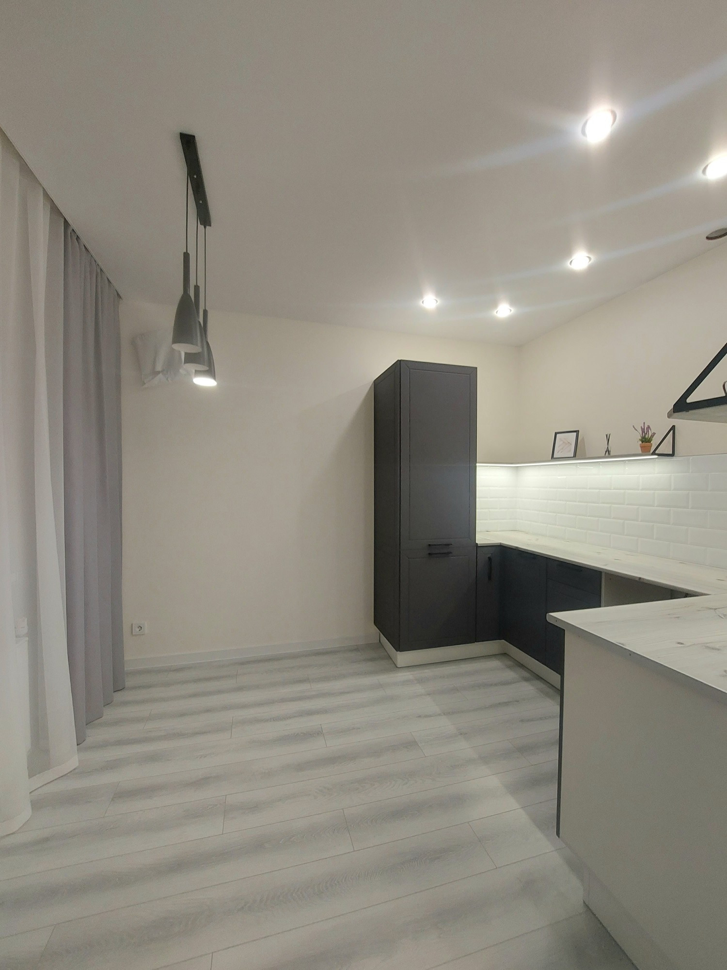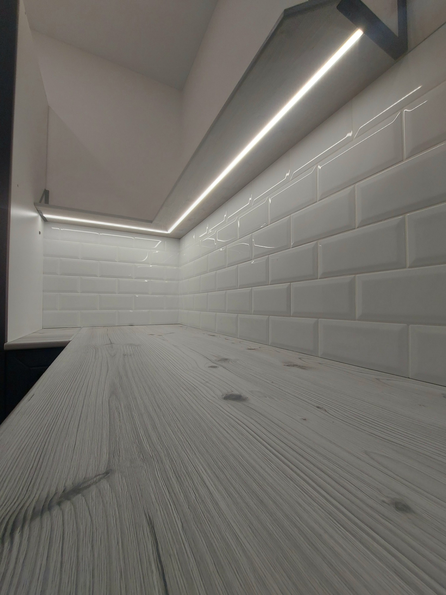 -кухонный гарнитур локаничный с фартуком из плитки белого цвета+ сенсорная подсветка