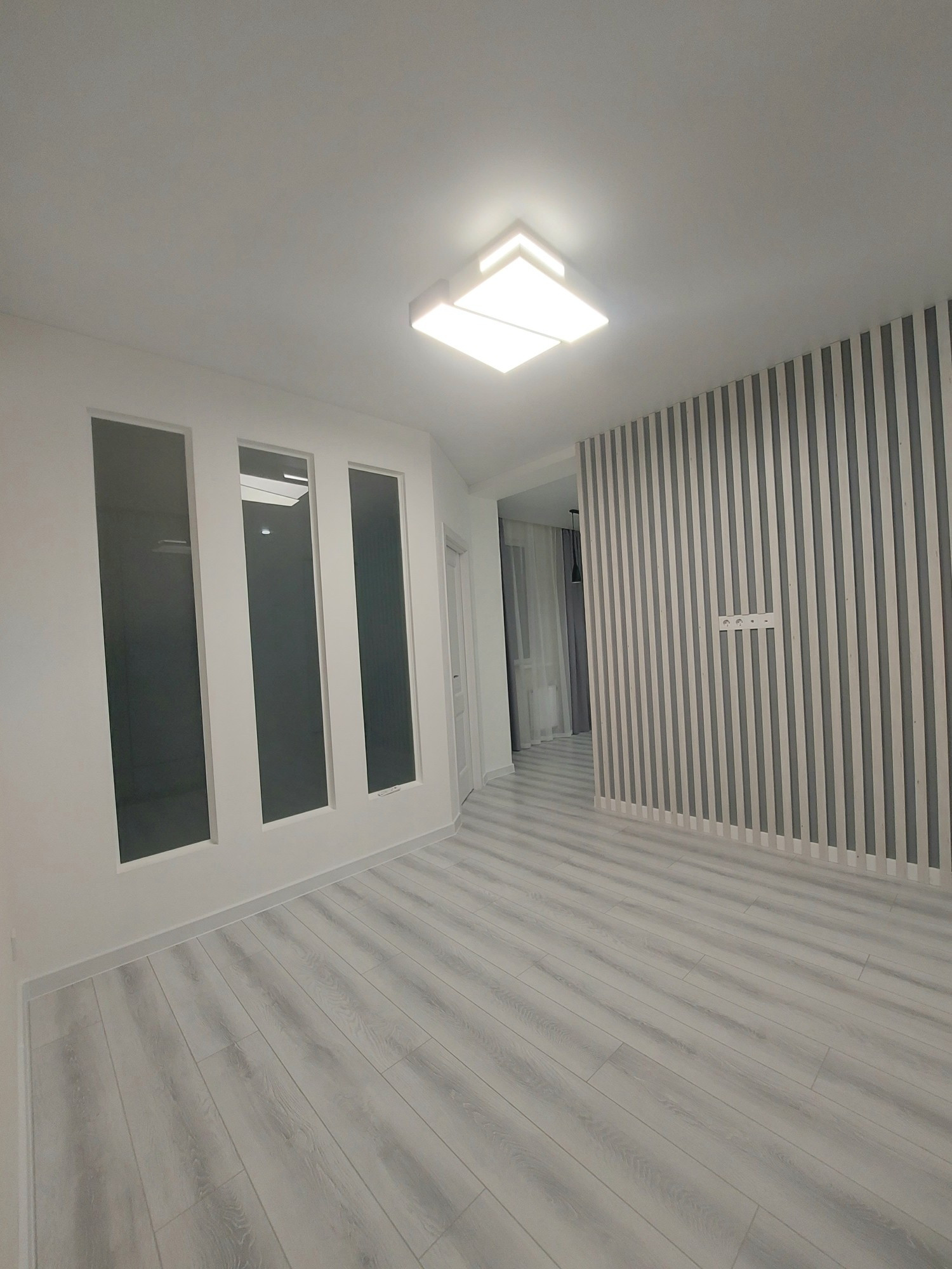 -в гостиной ламинат светлого натурального оттенка,стена для телевизора отделана декоративной рейкой что придает квартире изюменку и уют.Имеется глубокий шкаф купе!!!Помимо искусственного света дополнительно пуступает натуральный