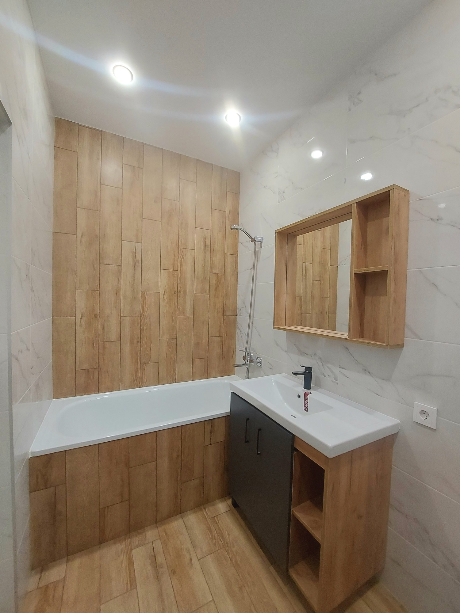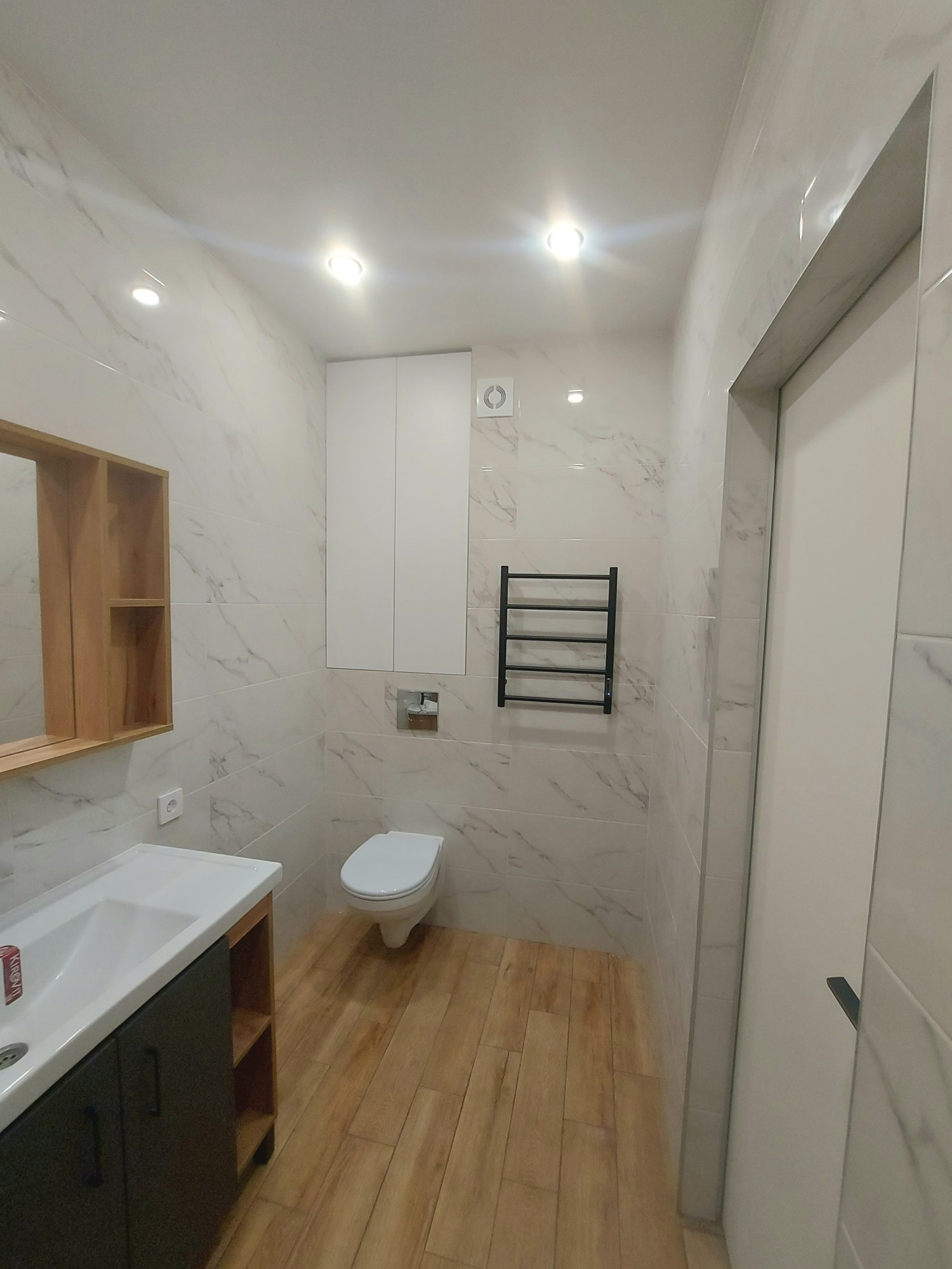 - сан. узел с дверью невидимкой, керамогранит натурального оттенка+светлая плиткаУстановленна ванная, гарнитур с зеркалом, коммуникации закрыты дверцами с кнопками