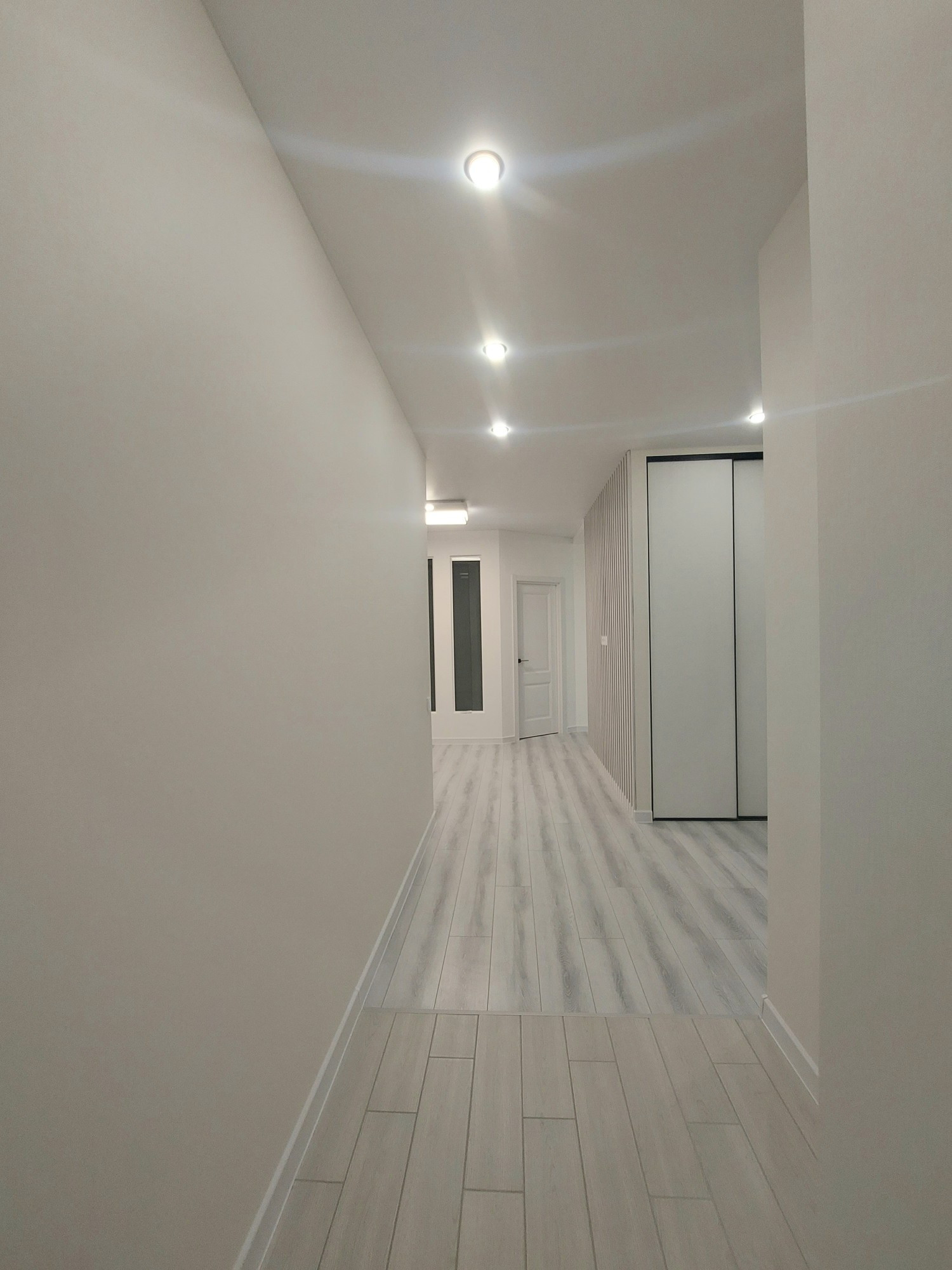 -потолки по всей квартире натяжные с большим колличеством света