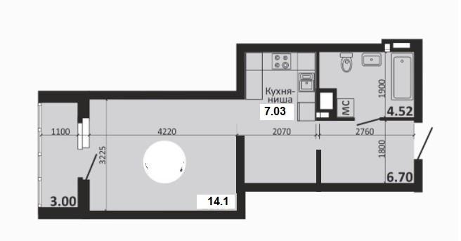 Площадь зонирована очень грамотно, практически полноценная 1к квартира с прихожей, кухней и жилой зоной.