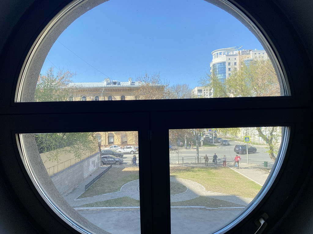 Окна ориентированы на ул. Самарскую. Перед окнами сквер. Закатное солнце.