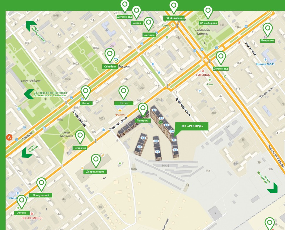 ЖК Рекорд (застройщик Новый Дон) располагается в Промышленном районе города Самара в границах улиц Физкультурная и Краснодонская. Отличная инфраструктура: рядом остановки общественного транспорта, метро, ТРК Вива Ленд, сквер Калинина, школы, детские сады.