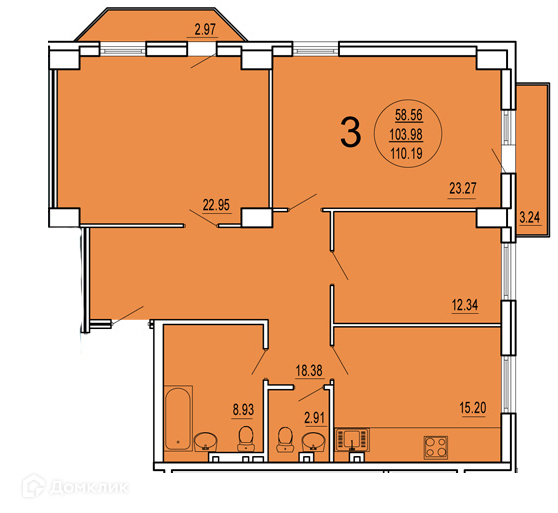 Общая площадь квартиры: 110.19 м2, ( кухня 15.20 кв.м.. комната 22.95 кв.м.+ лоджия 2.97 кв.м.,-комната 23.27 кв.м.м + лоджия 3.24 кв.м., комната12.34 кв.м.,  ванная и туалет 8.93 кв.м., гостевой туалет 2.91 кв.м., коридор 18.38 кв.м.)