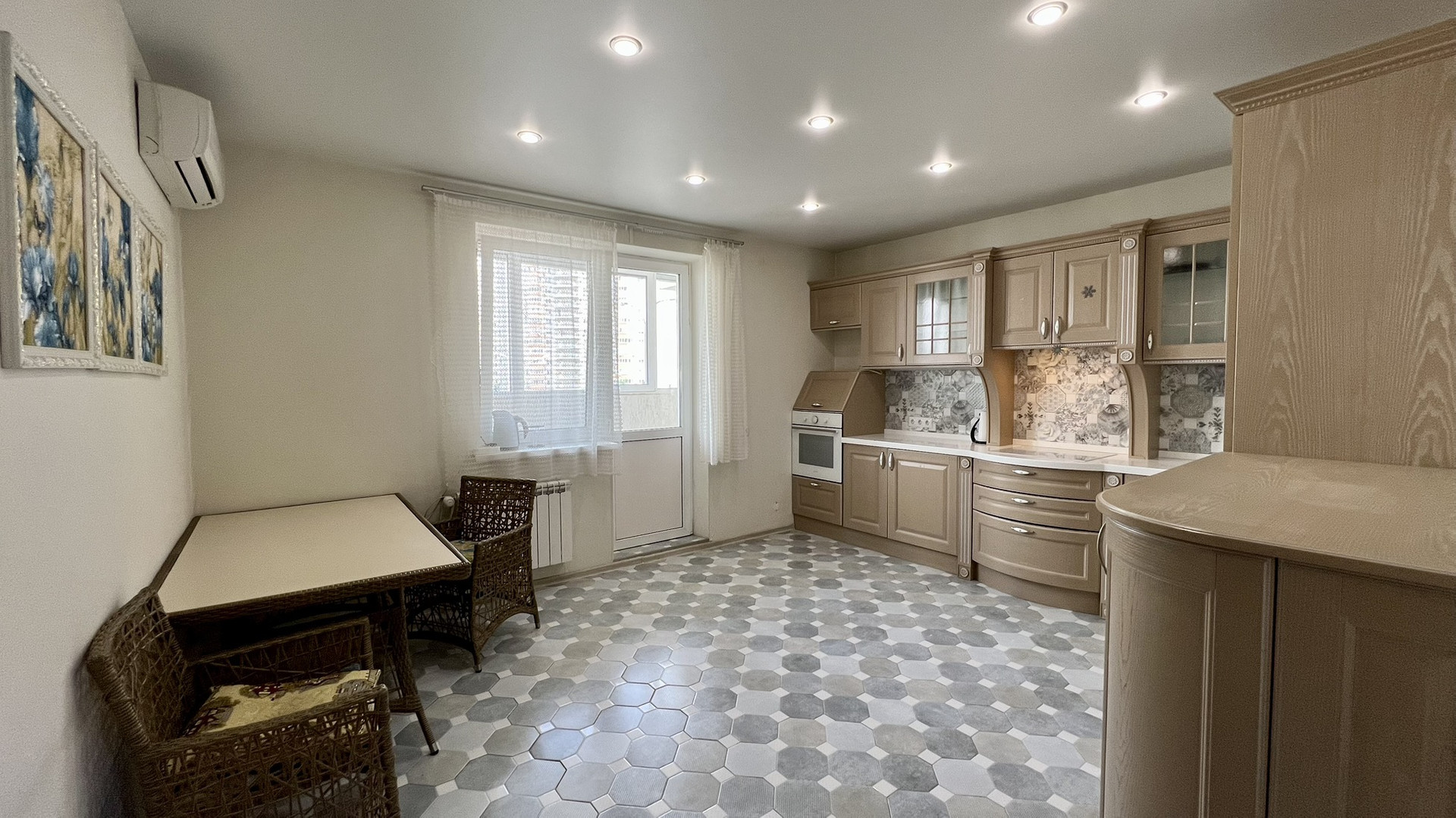 - Большая кухня 20 кв.м. с лоджией 6 кв.м.со встроенной техникой (микроволновая печь, Духовой шкаф электрический и варочная поверхность Gorenie, посудомоечная машина Bosch, встроенный большой холодильник Ariston)