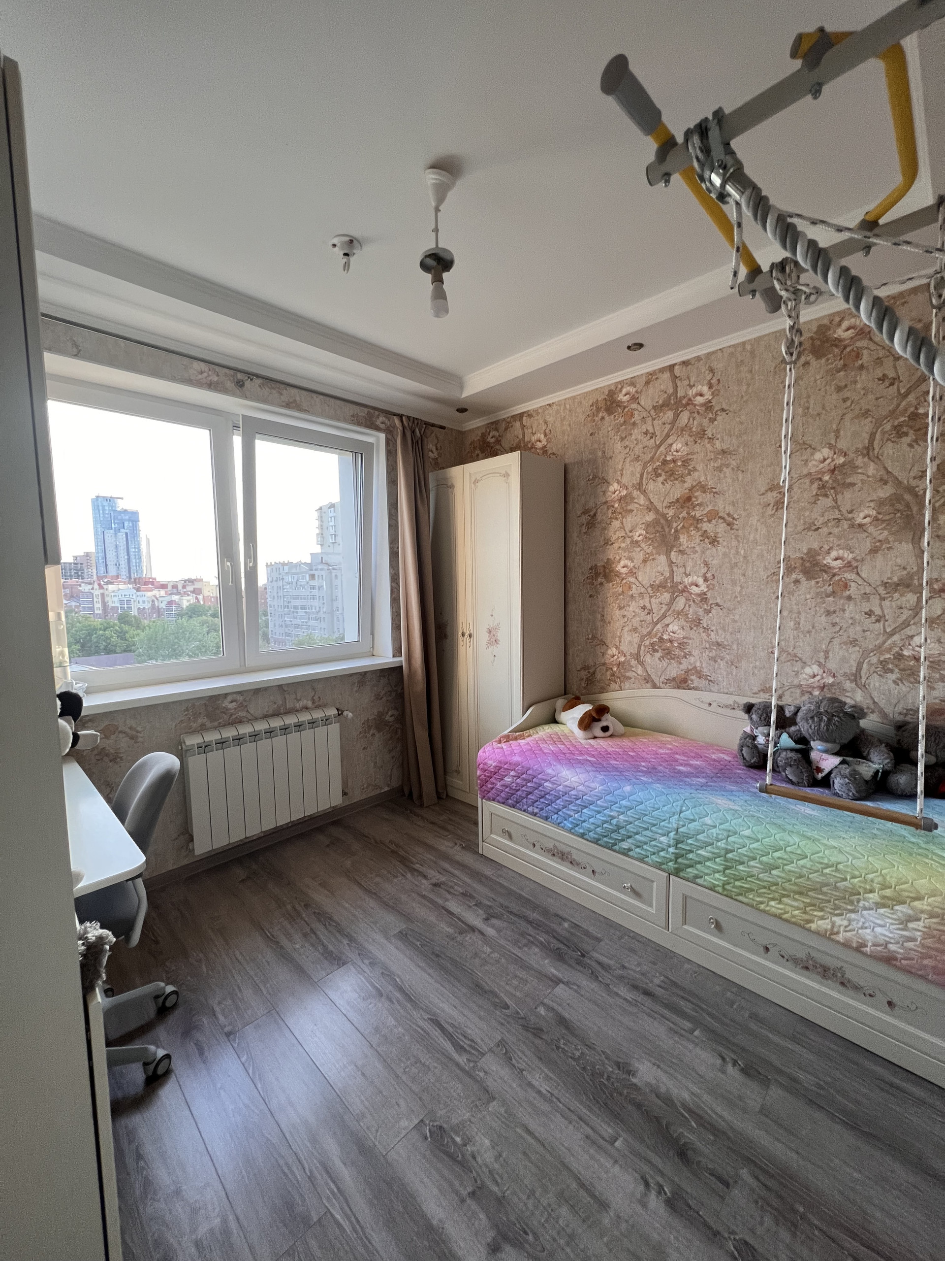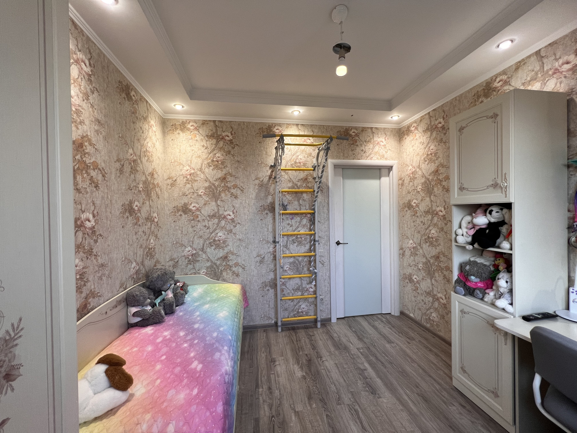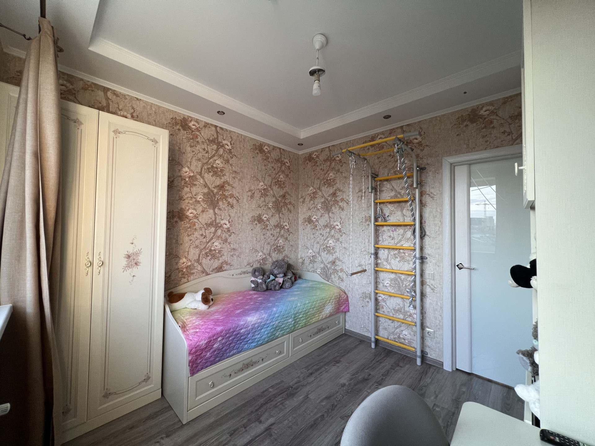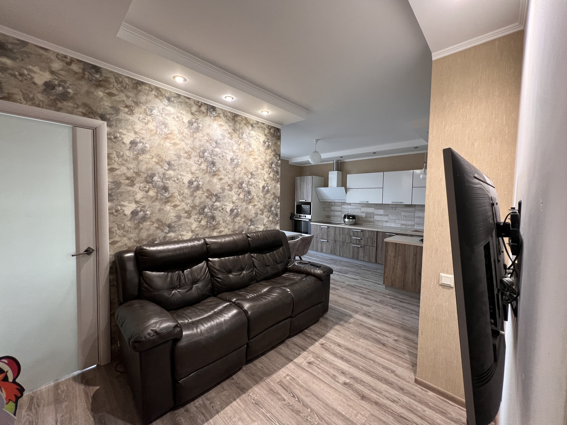 В квартире выполнена замечательная перепланировка, где использовано всё пространство максимально комфортно для проживания семьи с ребенком, а именно имеется детская комната, спальня для взрослых, просторная кухня с большой обеденной зоной, зона отдыха (полноразмерный диван на несколько человек и TV-зона).