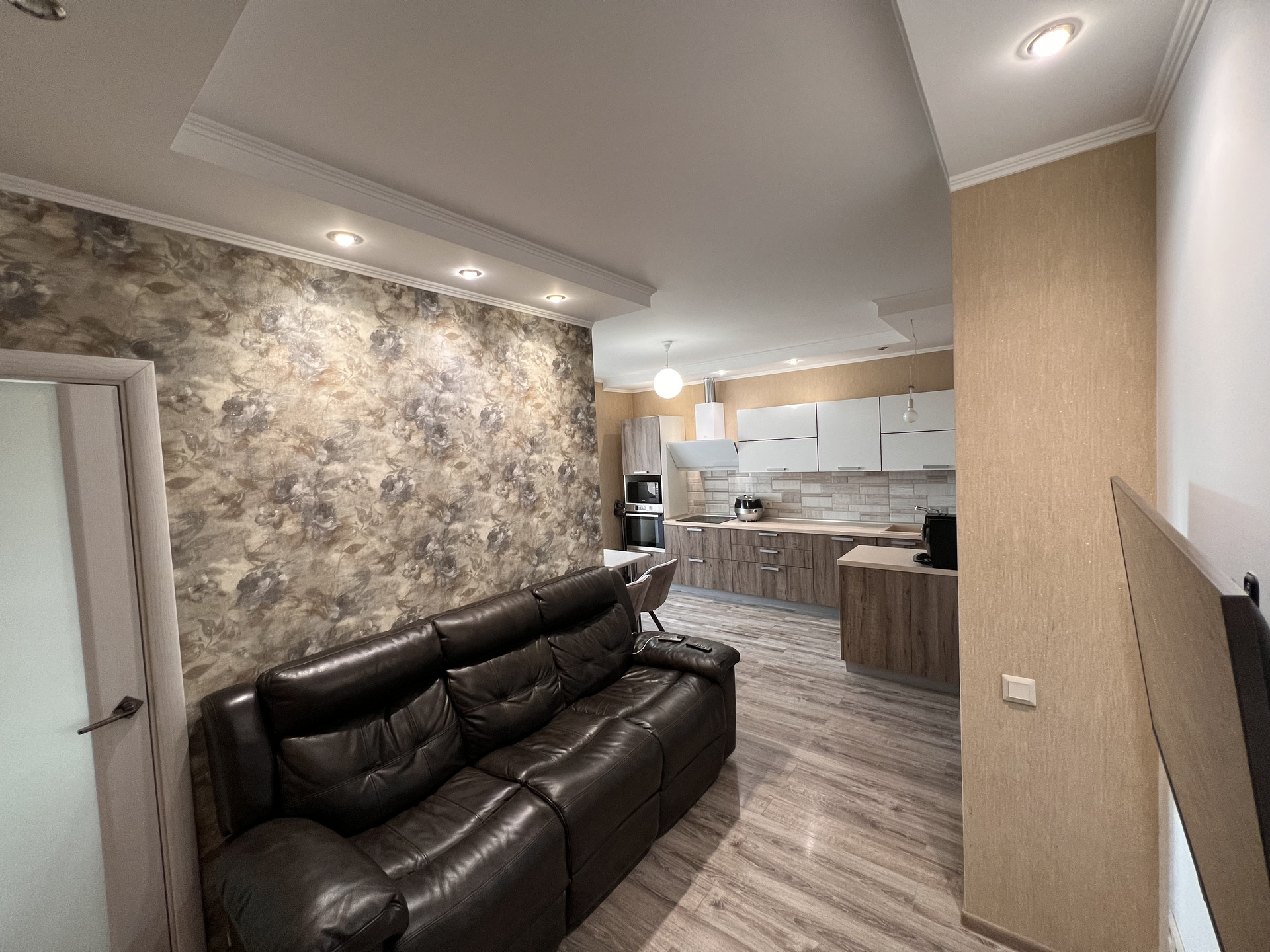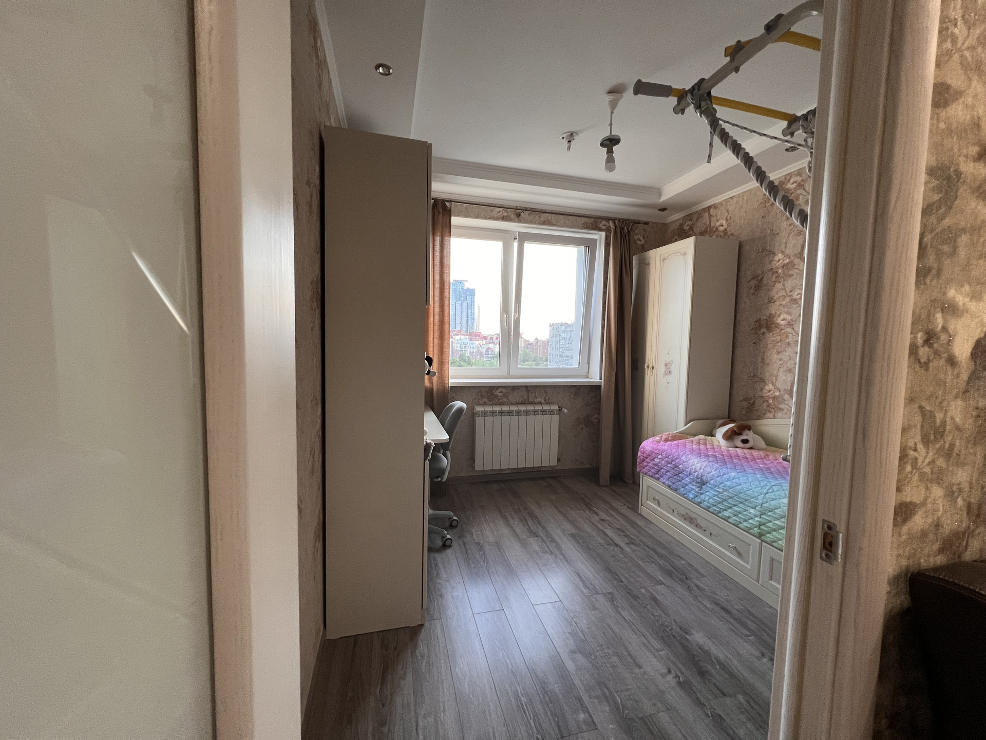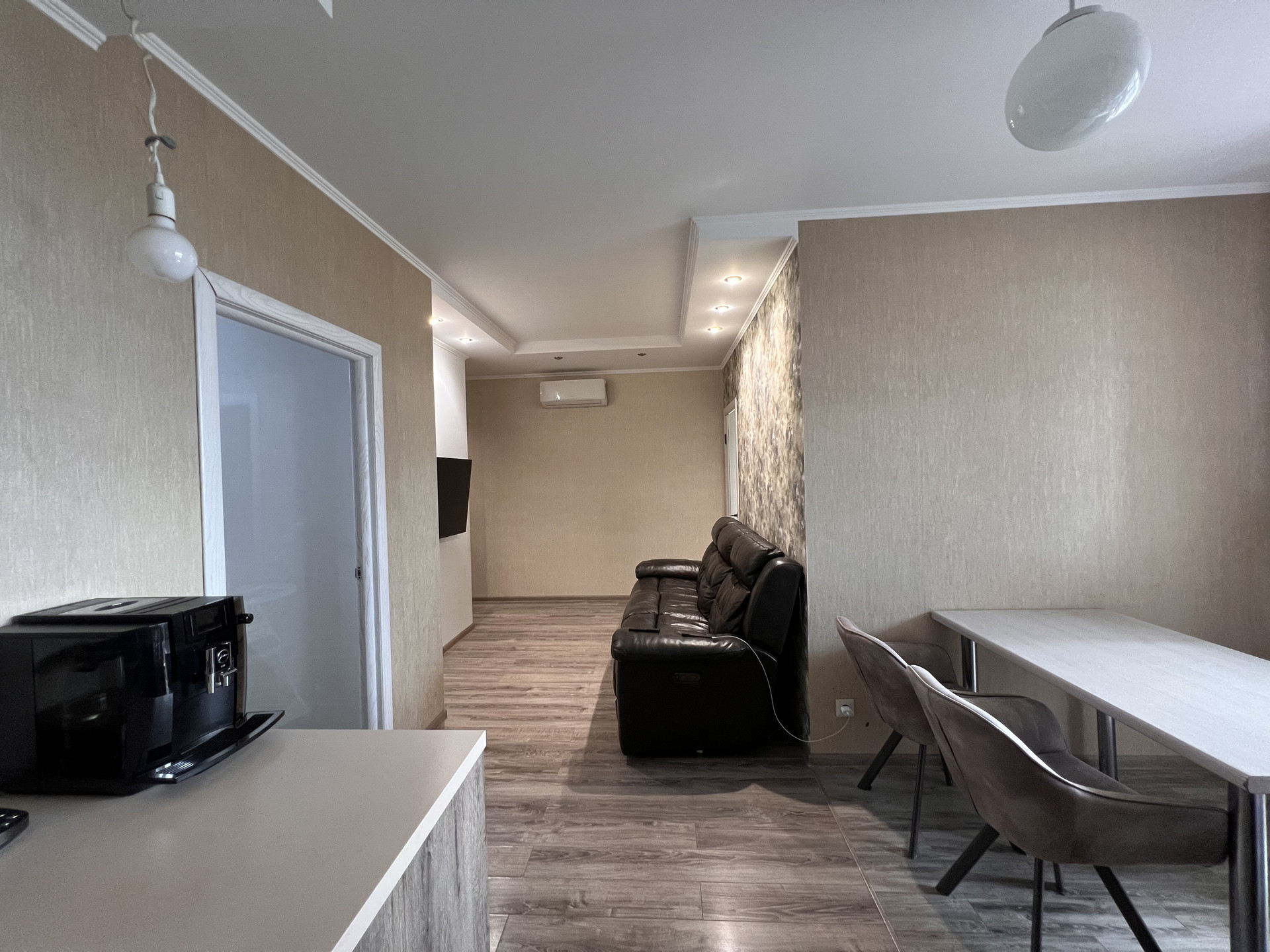 В квартире выполнена замечательная перепланировка, где использовано всё пространство максимально комфортно для проживания семьи с ребенком, а именно имеется детская комната, спальня для взрослых, просторная кухня с большой обеденной зоной, зона отдыха (полноразмерный диван на несколько человек и TV-зона).