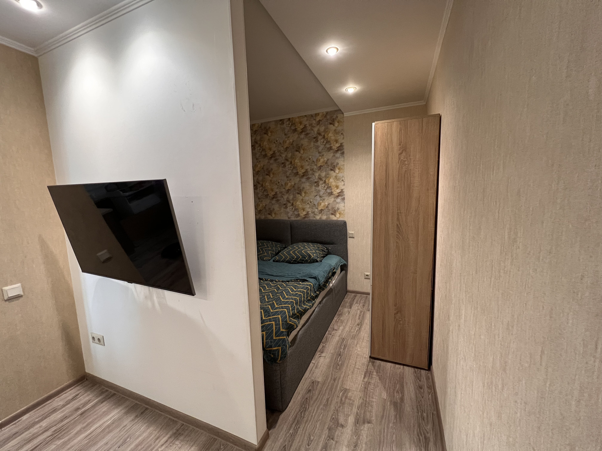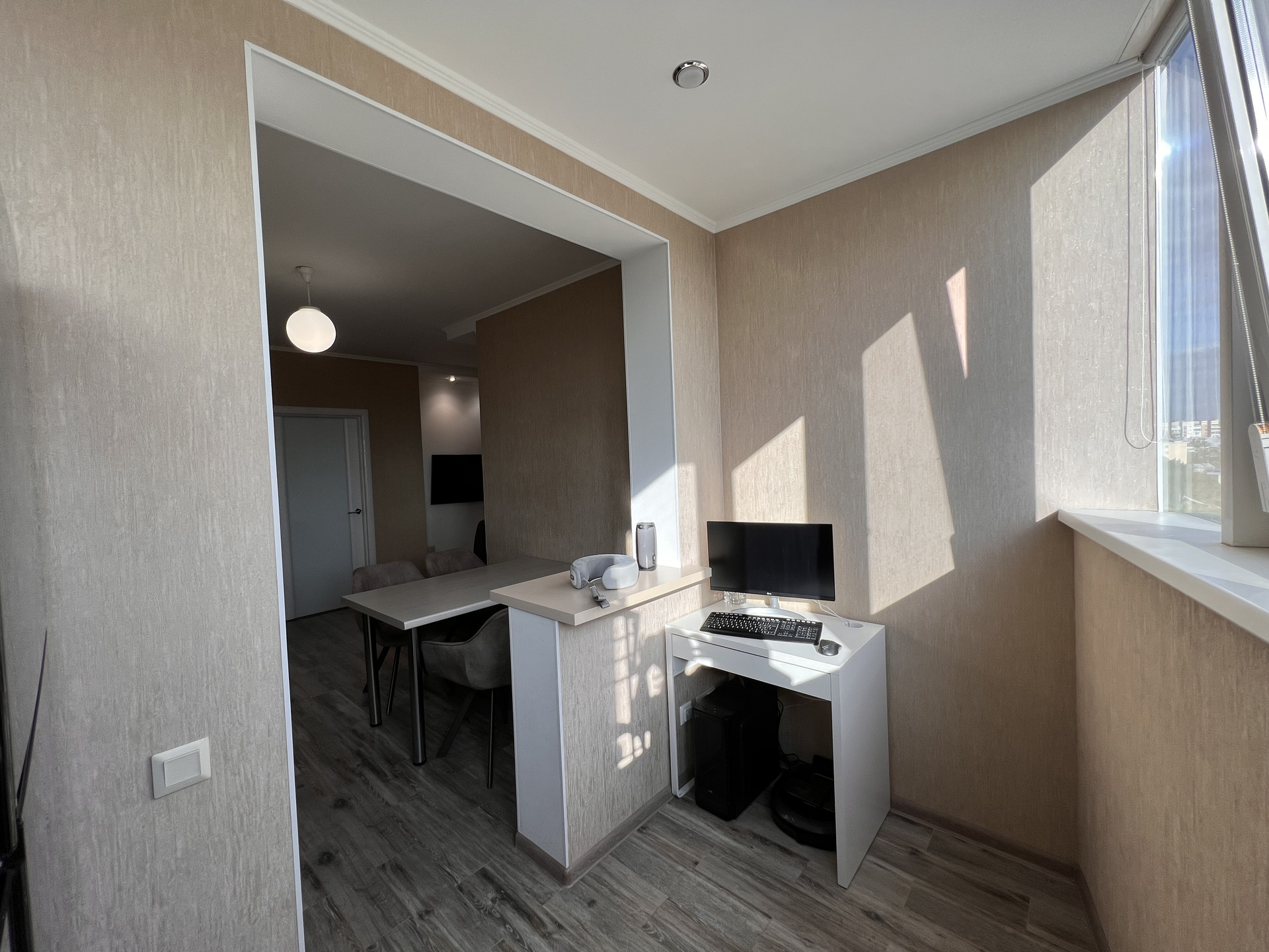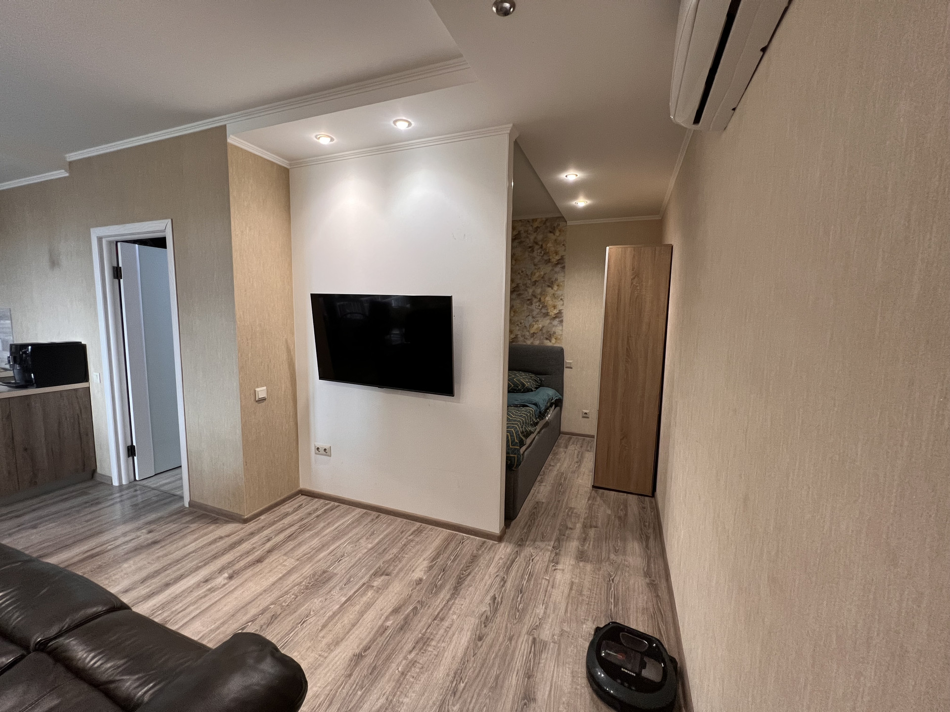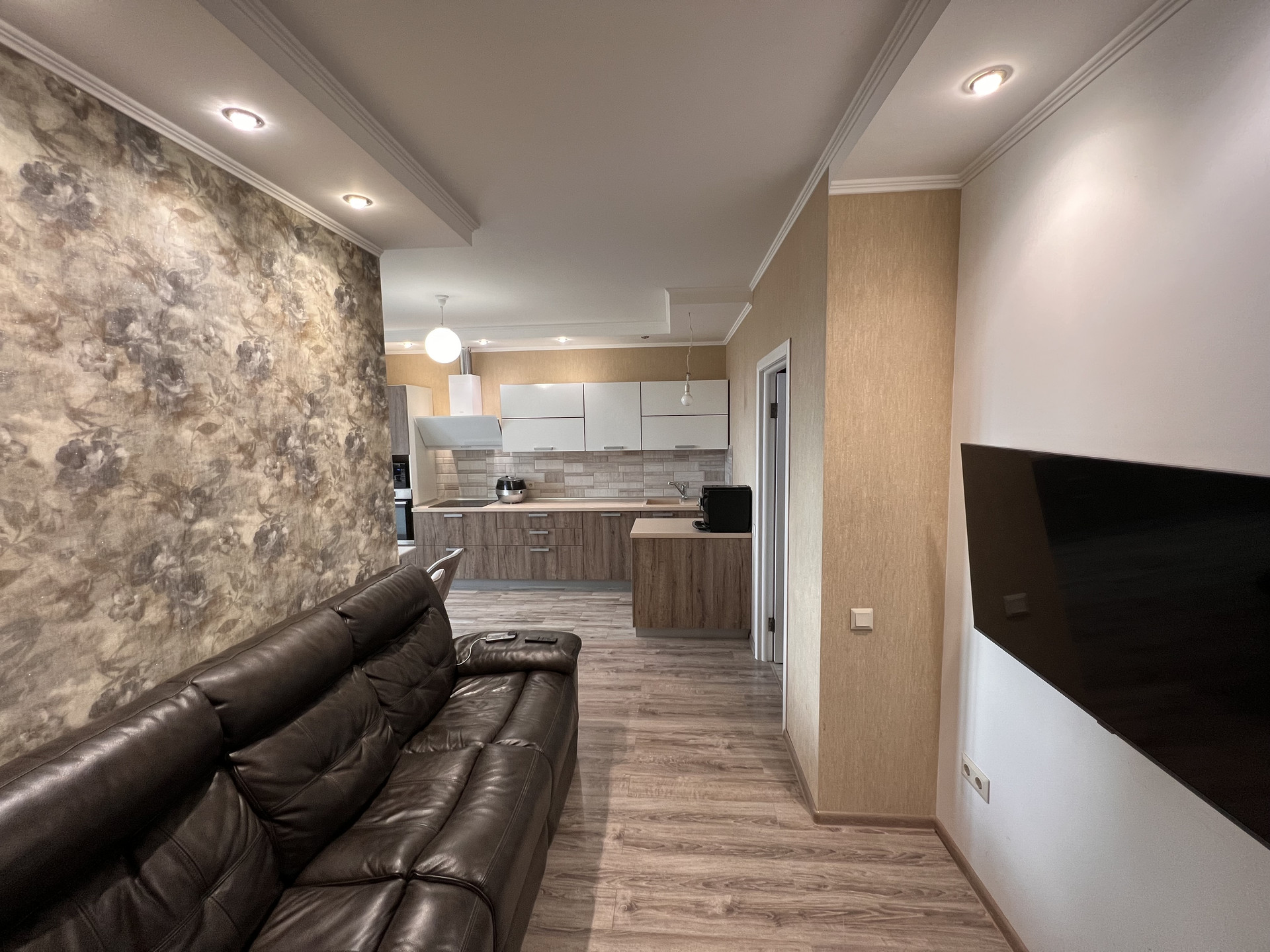 В квартире выполнена замечательная перепланировка, где использовано всё пространство максимально комфортно для проживания семьи с ребенком, а именно имеется детская комната, спальня для взрослых, просторная кухня с большой обеденной зоной, зона отдыха (полноразмерный диван на несколько человек и TV-зона).