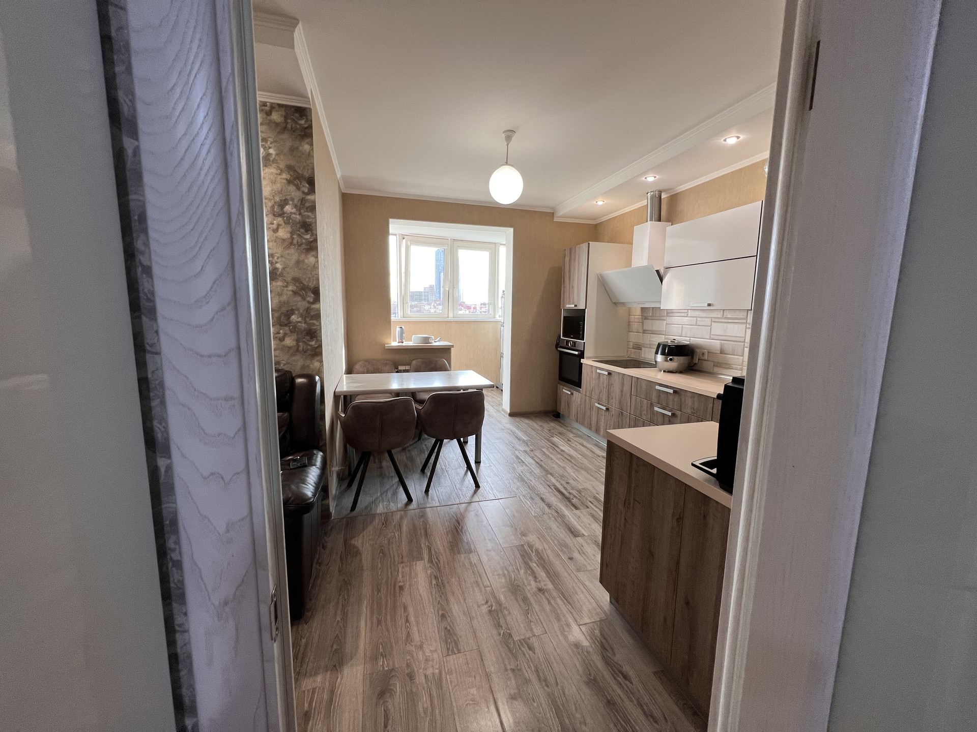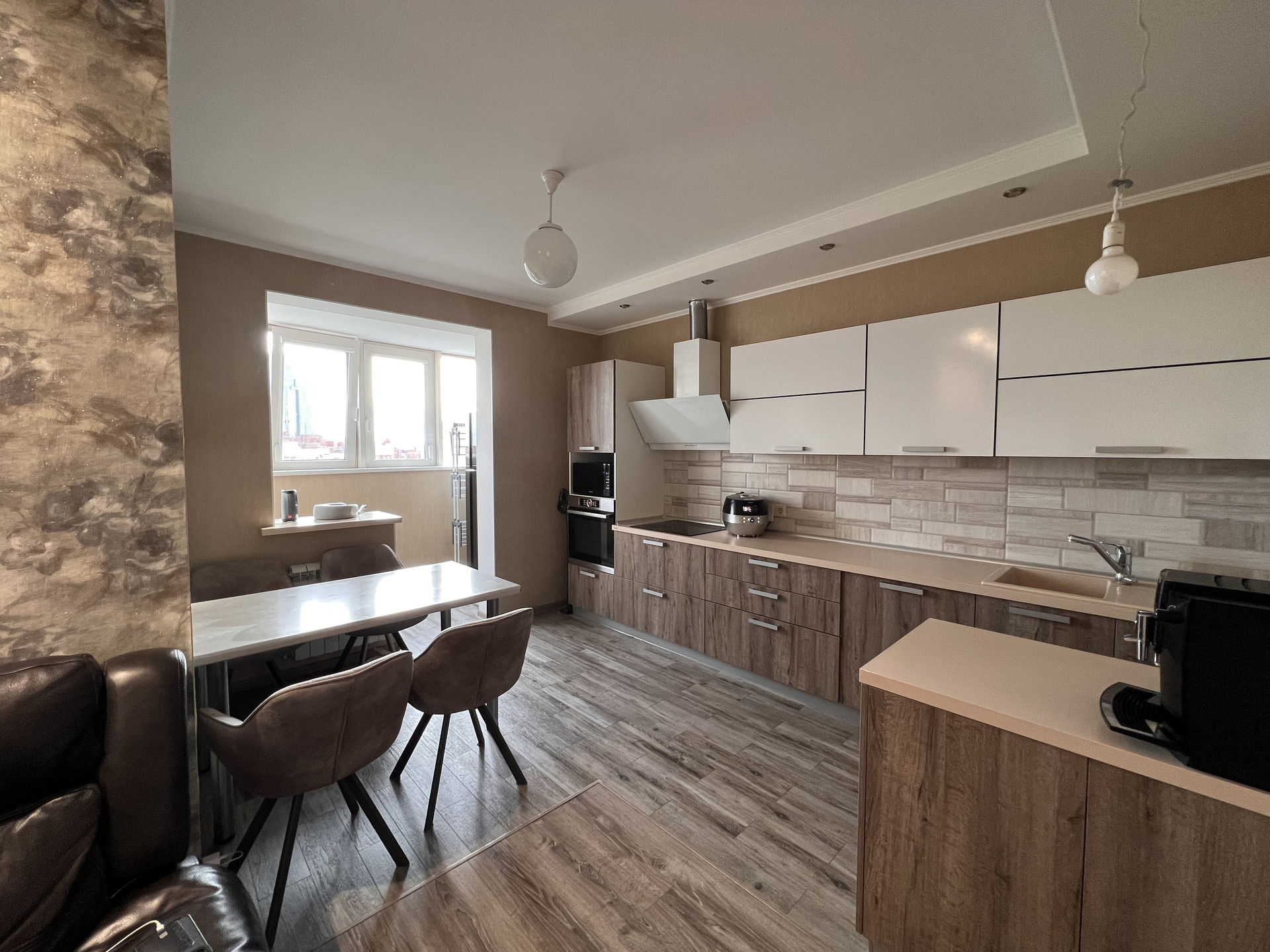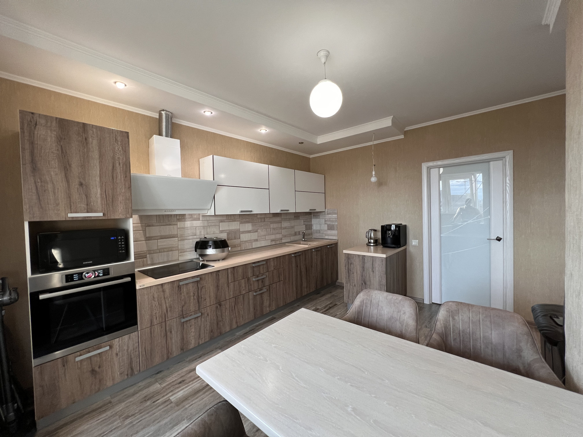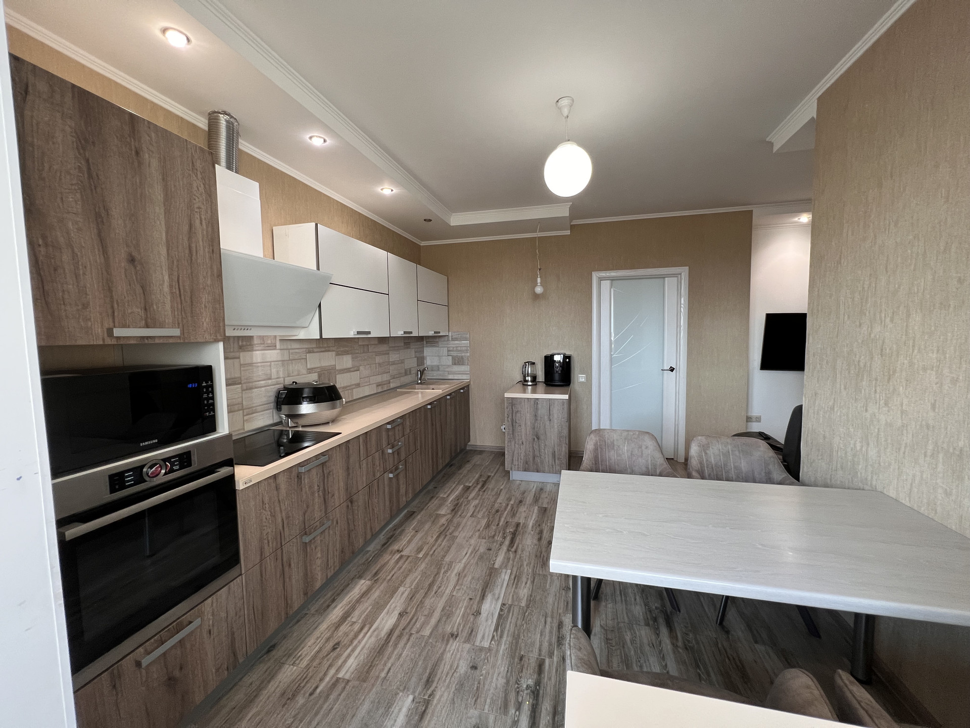 Квартира светлая, теплая, имеется теплый пол, установлены два кондиционера, использованы качественные отделочные материалы. Установлена кухня Дриада со всеми возможными доводчиками, подъемными механизмами и материалами высшего качества, имеется встроенная техника.