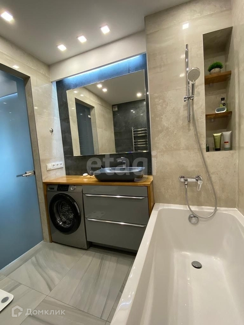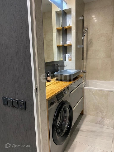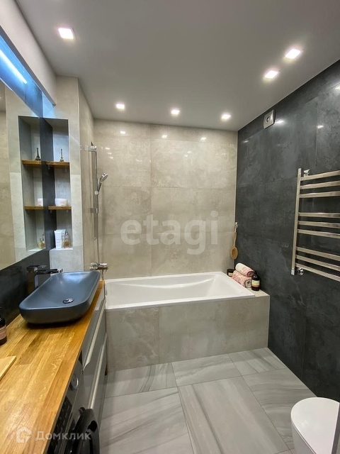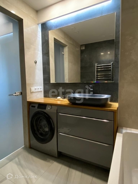 Ванная комната оборудована встроенным электрическим подогревателем, дубовой столешницей и зоной для умывания с тремя видами подсветки.