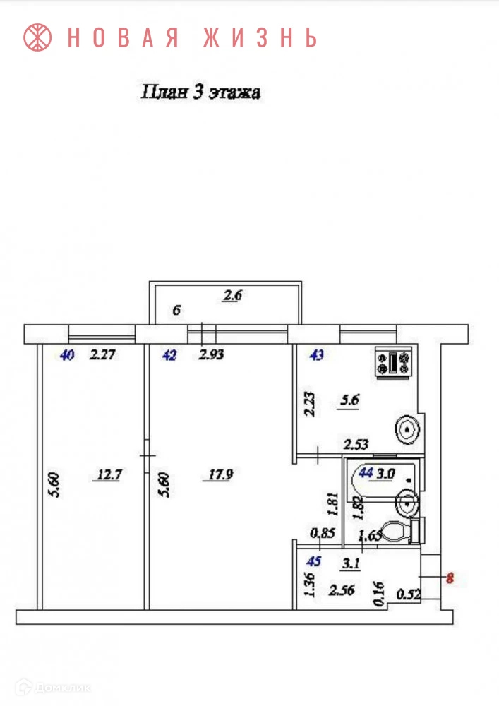 Общая площадь 42.3 м2